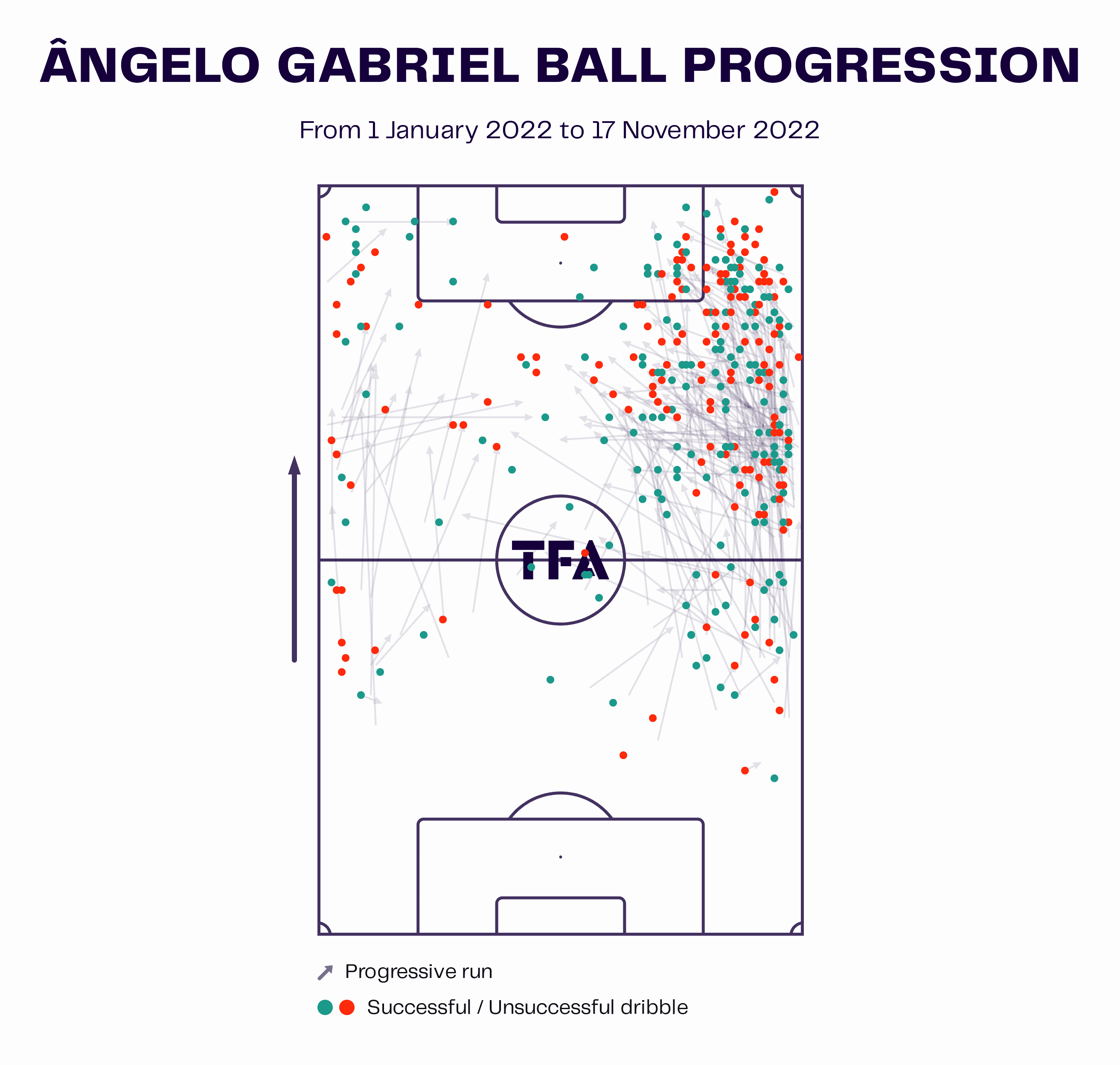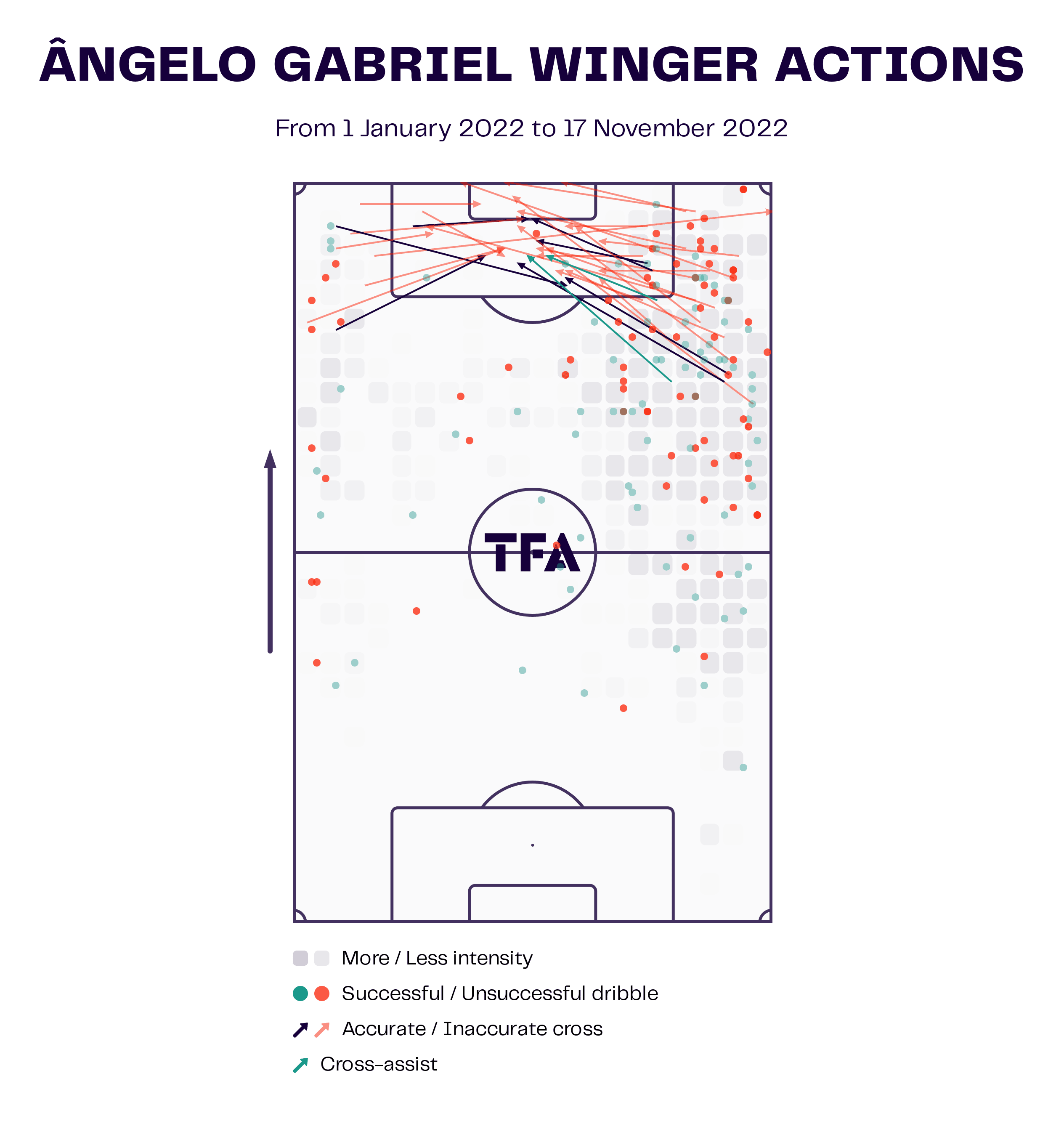 We will explore these strengths and characteristics more in-depth later, but in summary, Ângelo is a dynamic winger capable of creating danger and playing a role in possession through both his dribbling and passing ability.