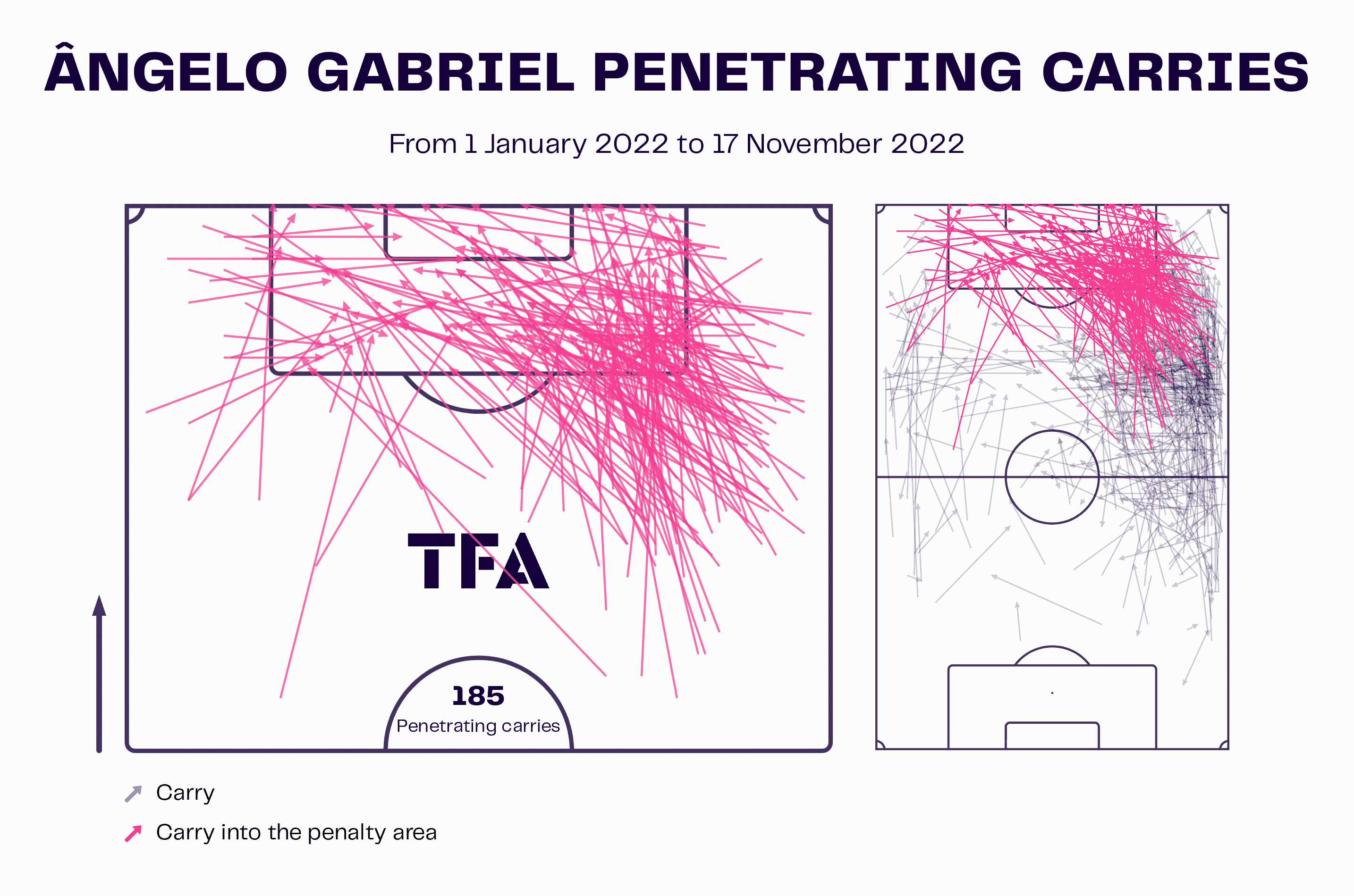 This is not the case for Ângelo, who as seen in the penetrating carries map below, has no difficulty dribbling through the opposition’s low block and entering the box.
