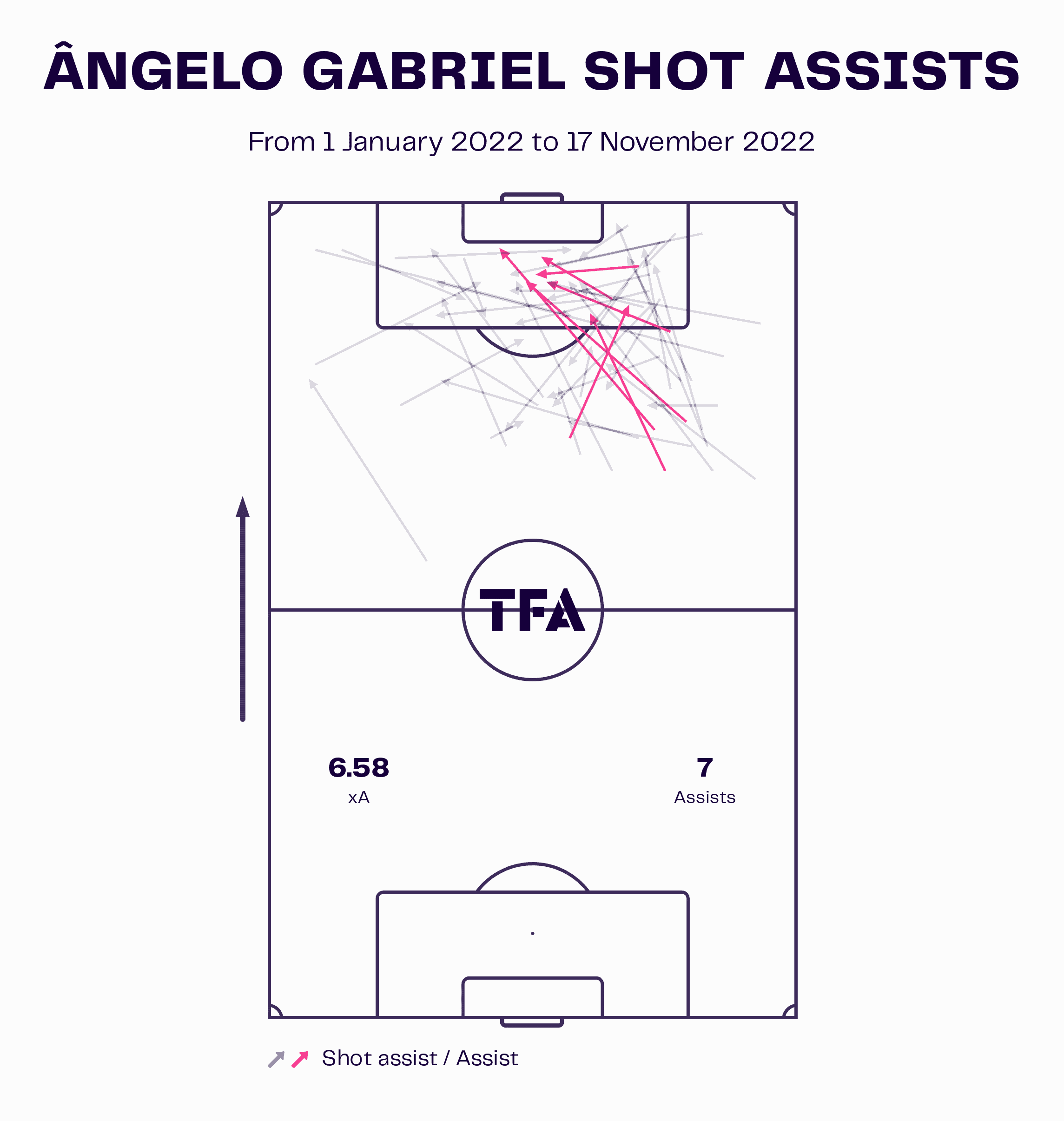 In the Série A 2022, Ângelo Gabriel had 0.32 assists per 90 from a similar 0.27 xA per 90.