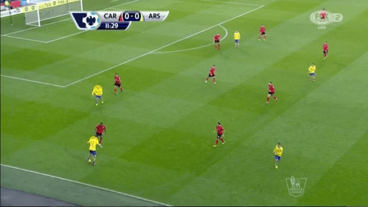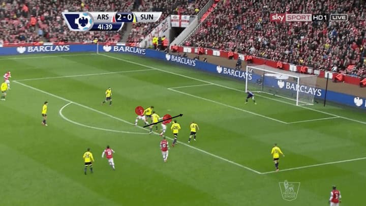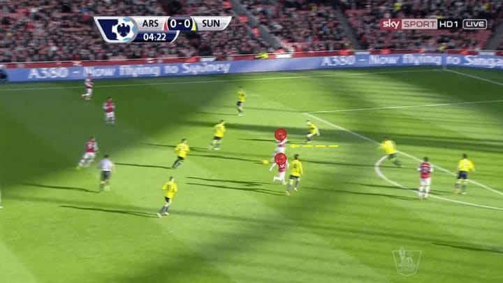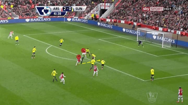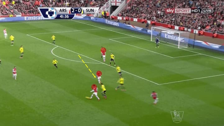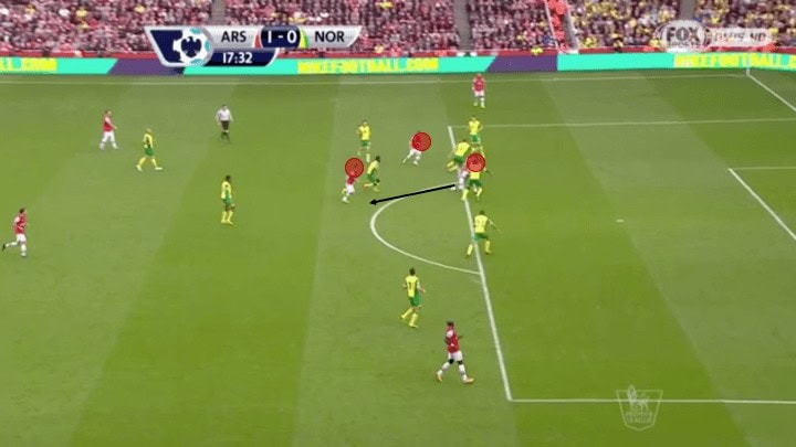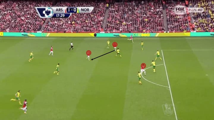 The picture above illustrates just how much movement and fluidity this group utilised. Here we see current Chelsea player Olivier Giroud, a centre-forward on the ball in the left channel. With left-back Gibbs who ran inside and took up Giroud’s normal position. While this may seem minimal and not particularly influential it was these types of movements that made this group so lethal in their attack. The reason being it required defenders to make decisions either follow their mark into spots taking them out of position creating holes for other players to run into. Or, stay put and allow the player to receive the ball facing forward passing them onto a teammate to defend as we see above.