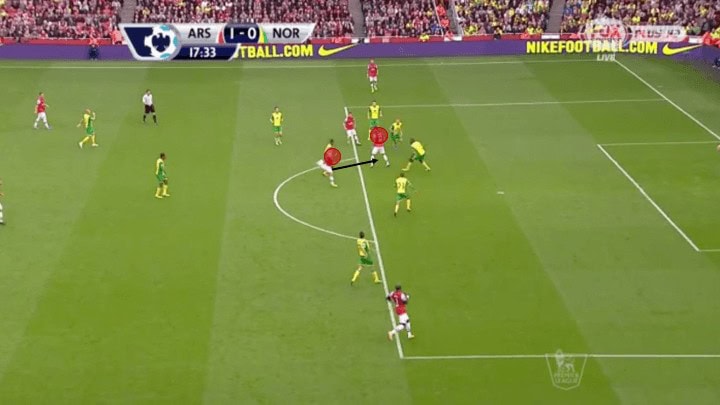 Giroud again receives and plays an outside of the foot pass in one touch, to Wilshere who is now at full speed in behind the opponent’s backline.