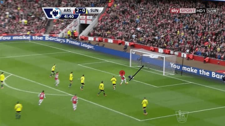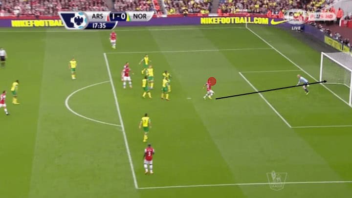 From here Wilshere is in 1v1 similar to Rosicky, and himself finishes with a first-time volley towards the near post.