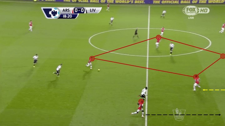 the diamond and creating space for Sagna to go forward. Rosicky’s defender in this sequence stays tight to him creating an opportunity for Arteta to play Sagna in behind. Ultimately, resulting in Sagna serving a brilliant cross to a late-arriving Santi Cazorla who was able to finish on the volley.