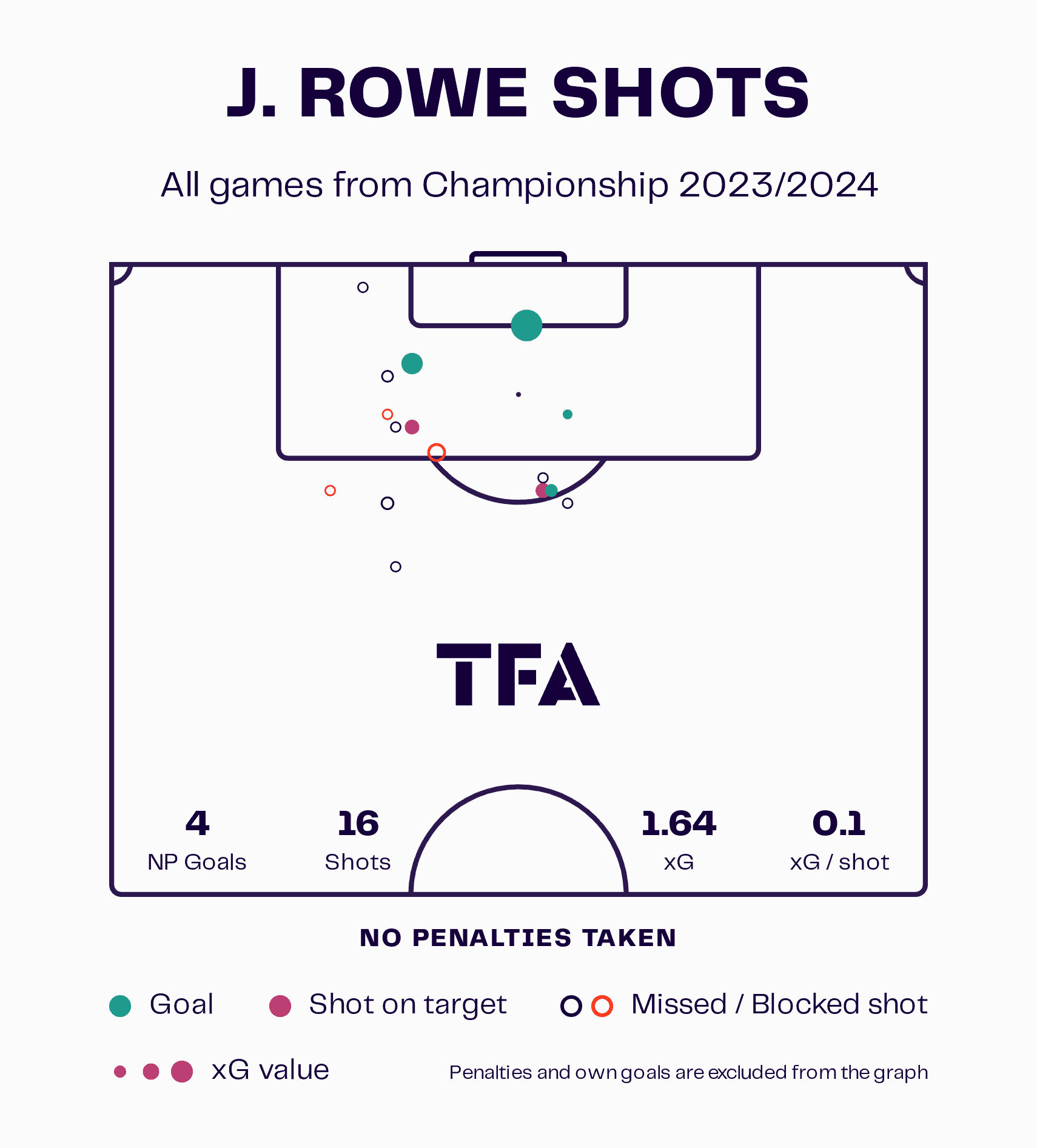 Here, we see the shot map for Rowe so far this season in the Championship, and he has generated four goals from 16 attempts. Since he plays mainly from the left side of the attack, we will see Rowe driving inside from that side on his right foot to generate shots on goal.