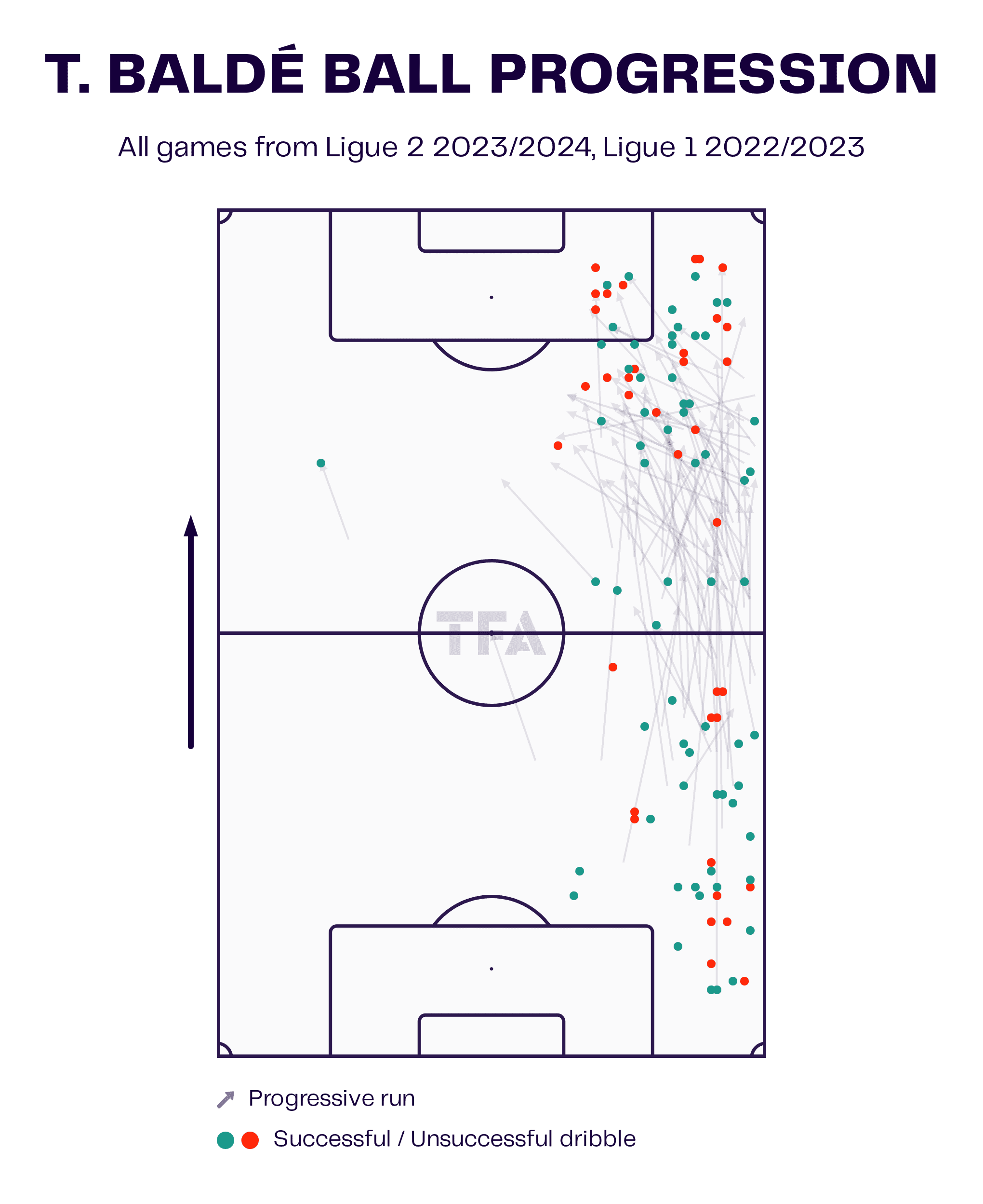Here, we have a movement map that shows all of Baldé’s progressive runs on the right-hand side from the 2022/23 and 2023/24 seasons. As you can clearly see, he is very active in terms of his movement and ball-carrying.