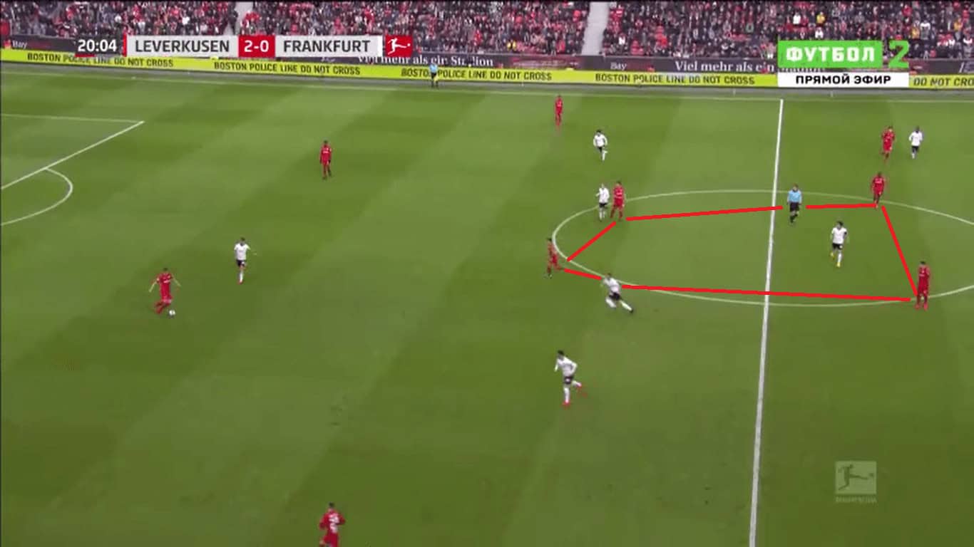 Additionally, we see an asymmetrical diamond in the midfield. Typically, you do not see this in a 4-2-3-1, but Leverkusen’s interpretation is slightly different. Since they do not have a classical striker in their roster, they use midfielders or wingers up-front. With Kevin Volland being injured, mainly Kai Havertz occupied this position on paper. In reality, there are two number tens playing next to each other and occupying the space between the lines. As Frankfurt defend in a 4-1-4-1 structure, Leverkusen are able to overload the opponent’s defensive midfielder, see image below.