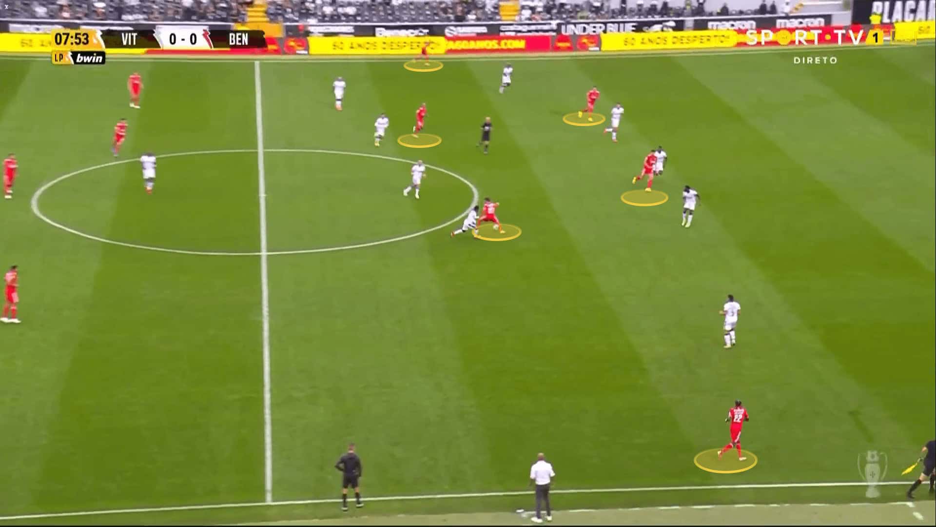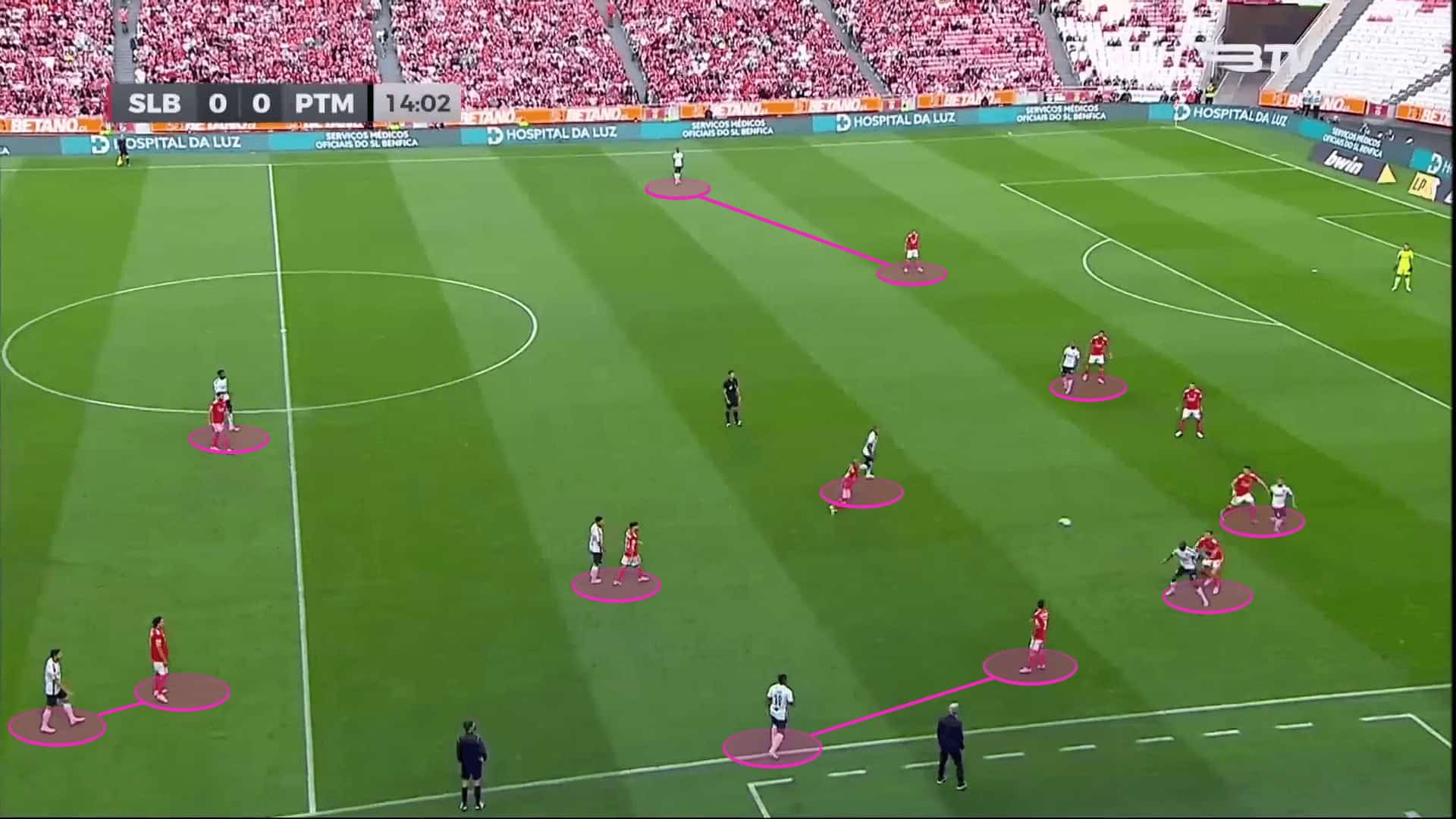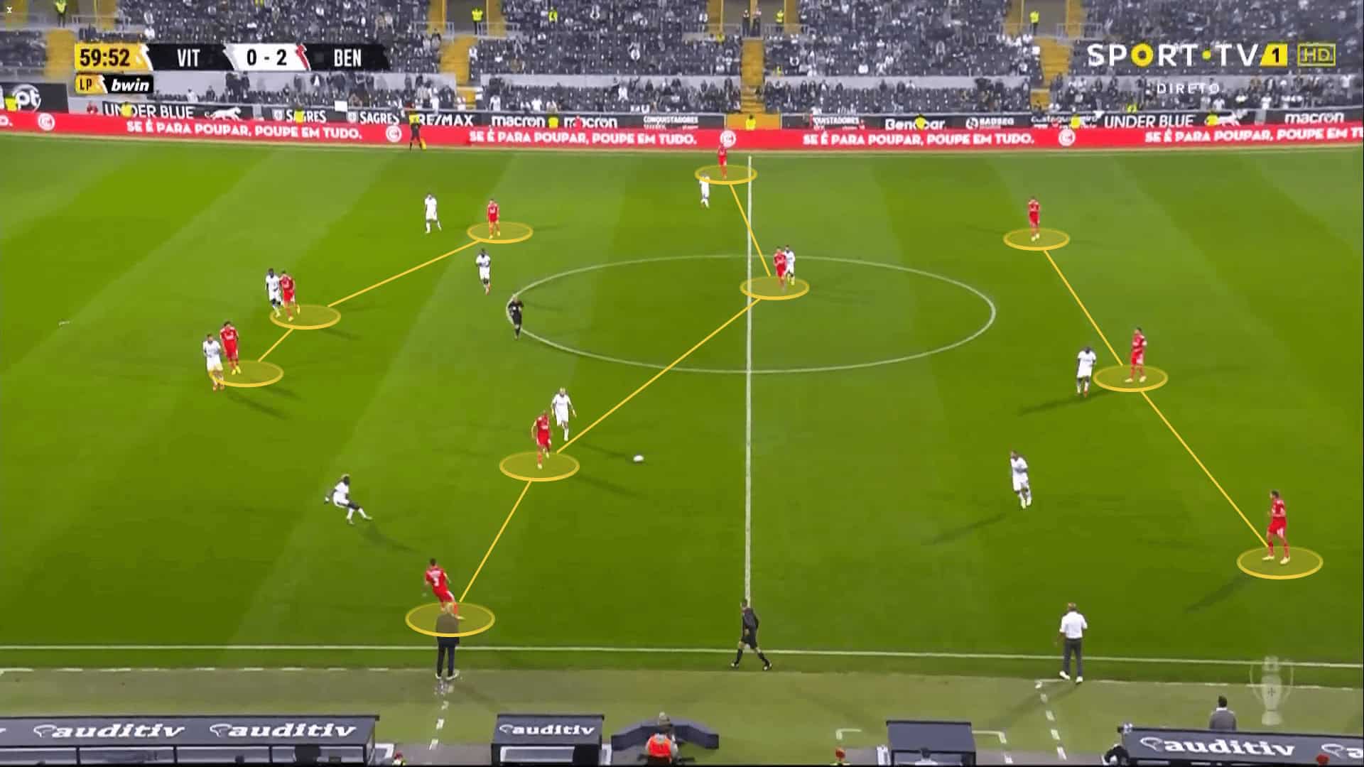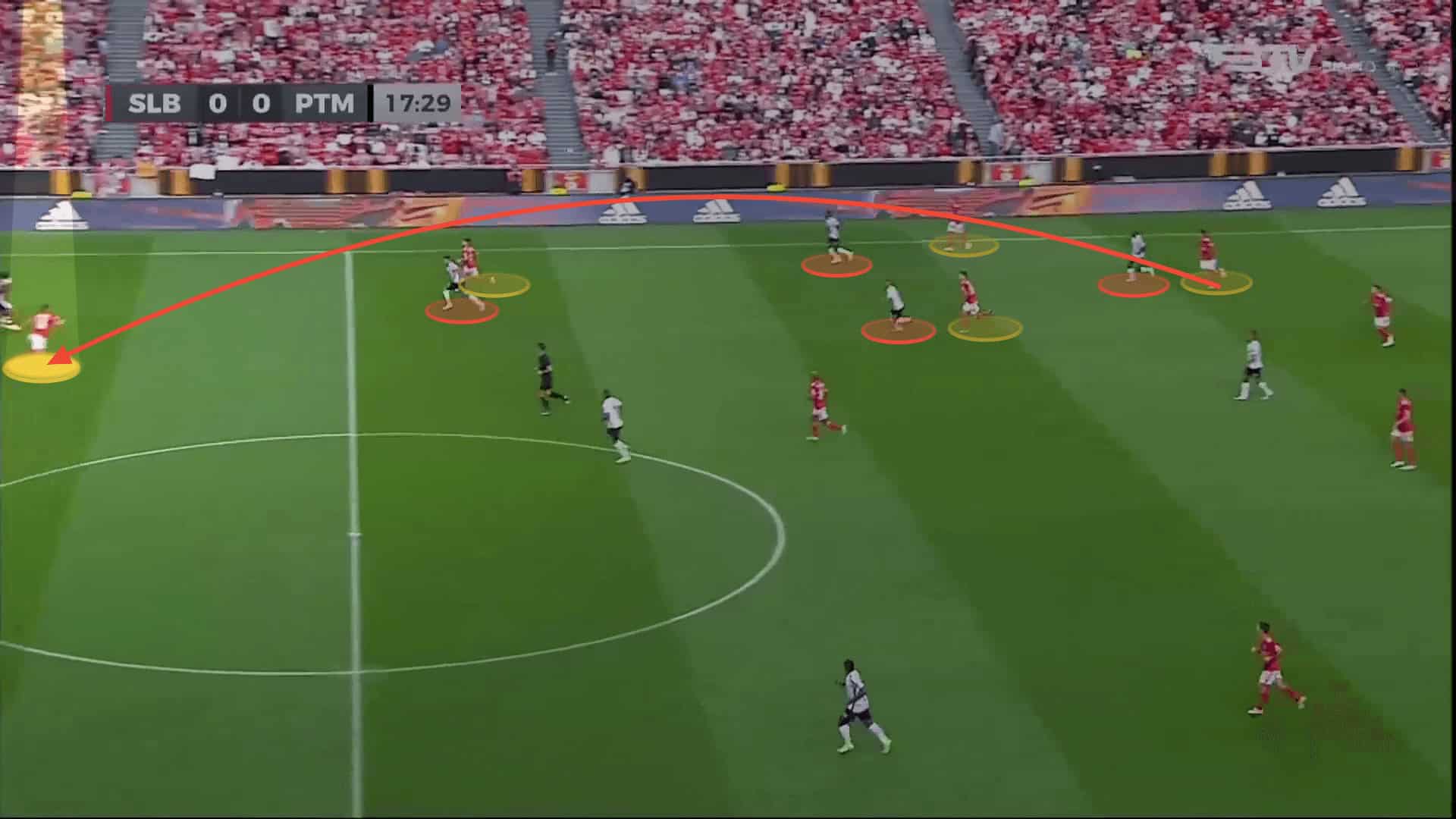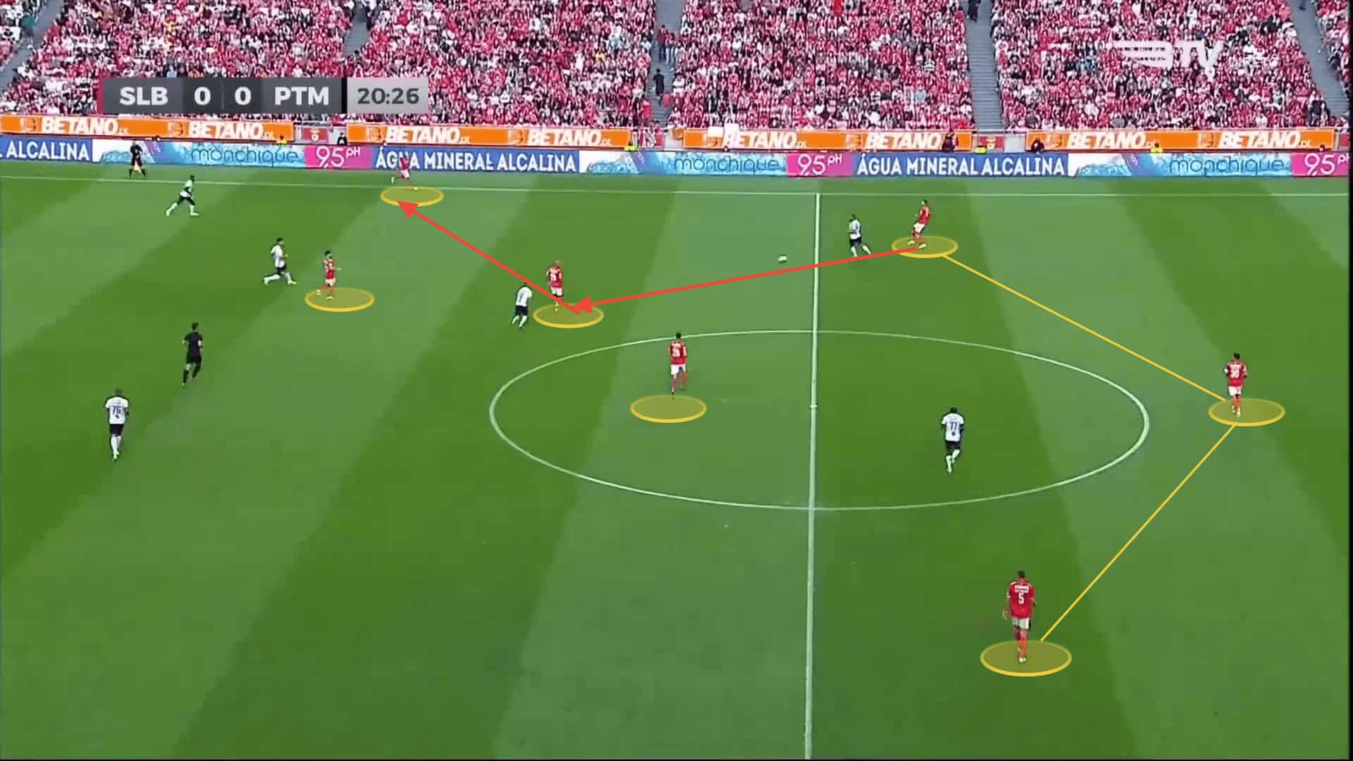 Benfica’s compact shape in possession and their constant movement decrease the spaces between the players and allows them to open the passing lanes and execute the short passing strategy well.