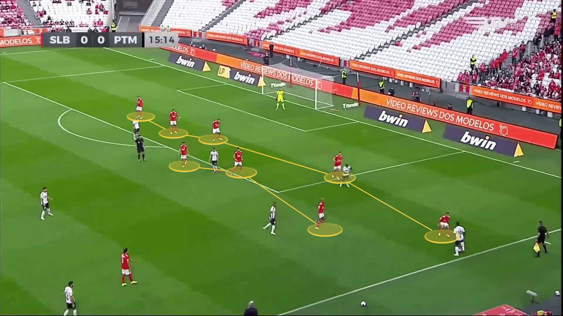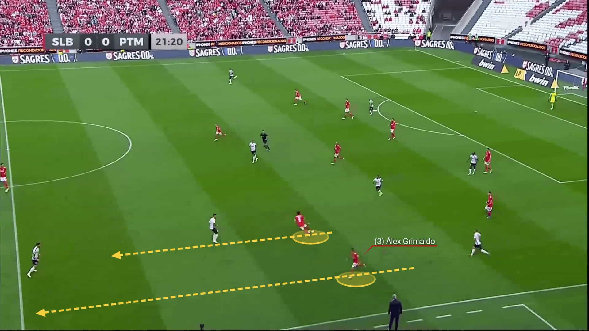 They are more vulnerable when caught on a counter, as it is difficult to regroup and drop players back so quickly. The three-man defensive line sometimes lack support and find it difficult to defend against skilful players. Veríssimo is often positioned high too and is prone to losing the ball rather often, which increases the risk in front of Benfica’s goal. Grimaldo is another player that often loses possession, making the team more vulnerable on the flanks, which their opponents often try to exploit.