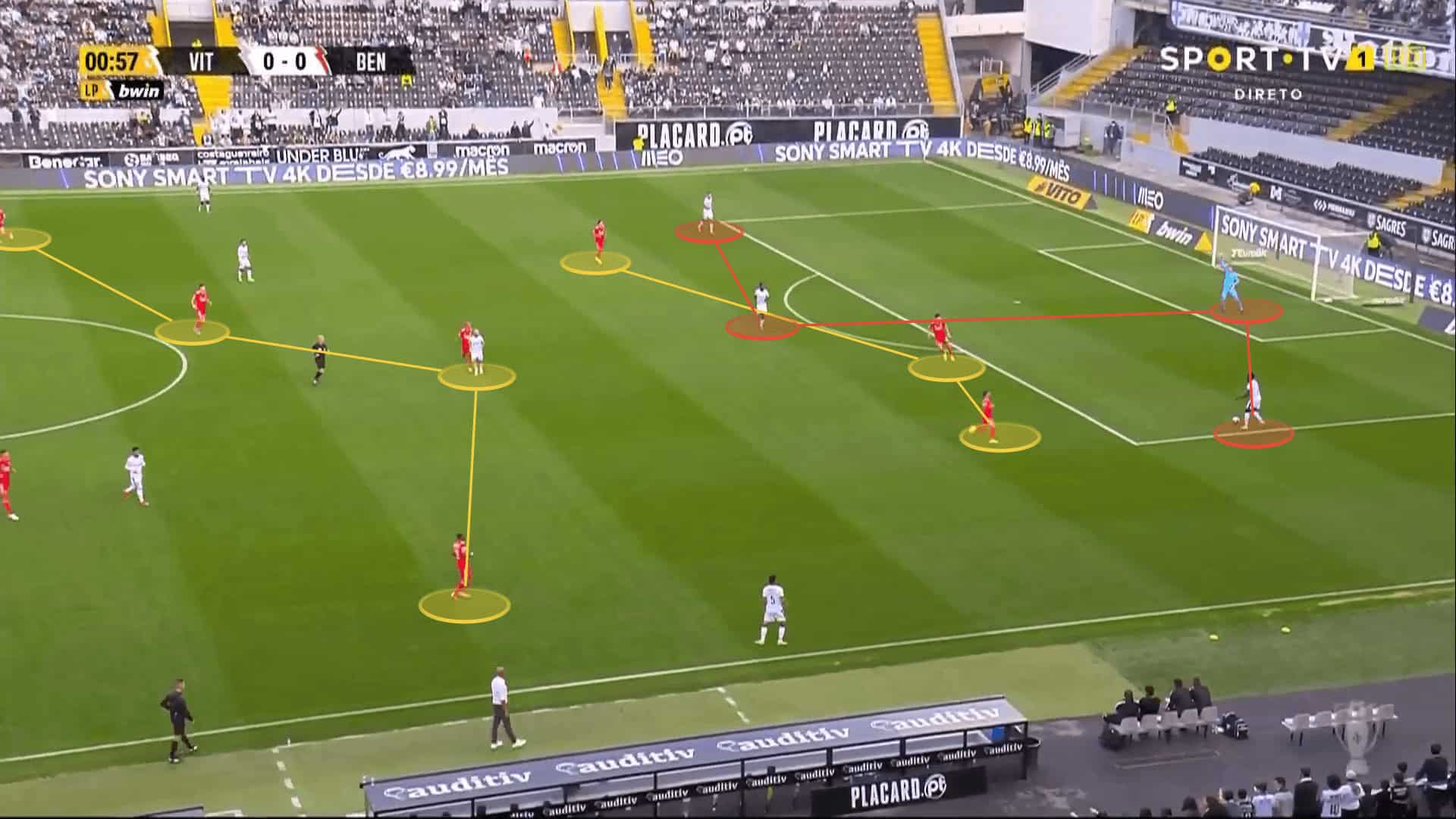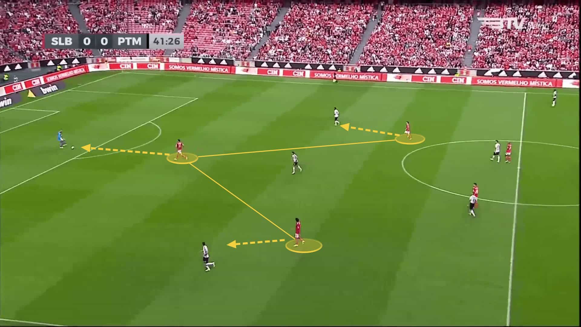 At the time of writing, the team have the highest pass completion rate in the league, with an average of 87.4% of their 517.36 passes per 90 being accurate. To progress the ball, they would either spread out wide to the wing-backs, relying on their pace and control to deliver it further or would use Julian Weigl centrally. He would drop deeper to pick up the ball and have a pivotal role in midfield due to his passing abilities (91% of pass accuracy per 90). João Mário would also move around, acting as a passing outlet, having an important role in the half-spaces.