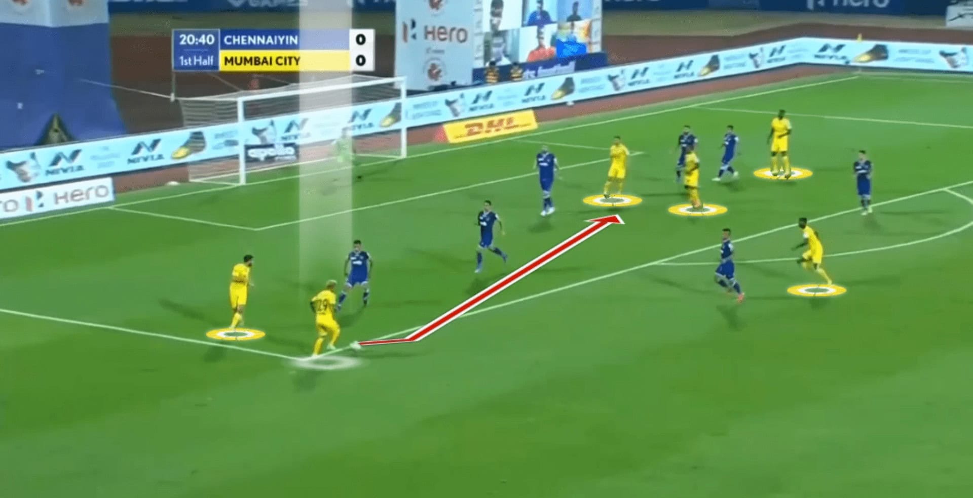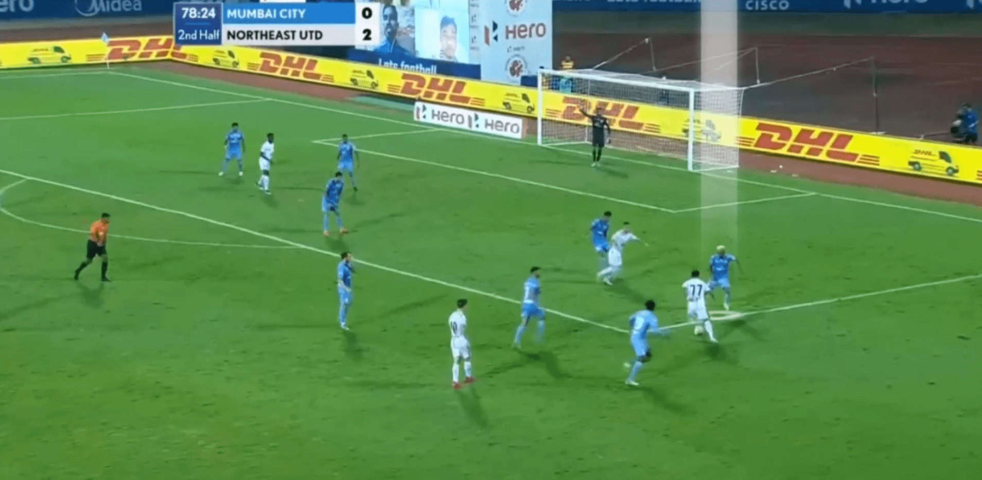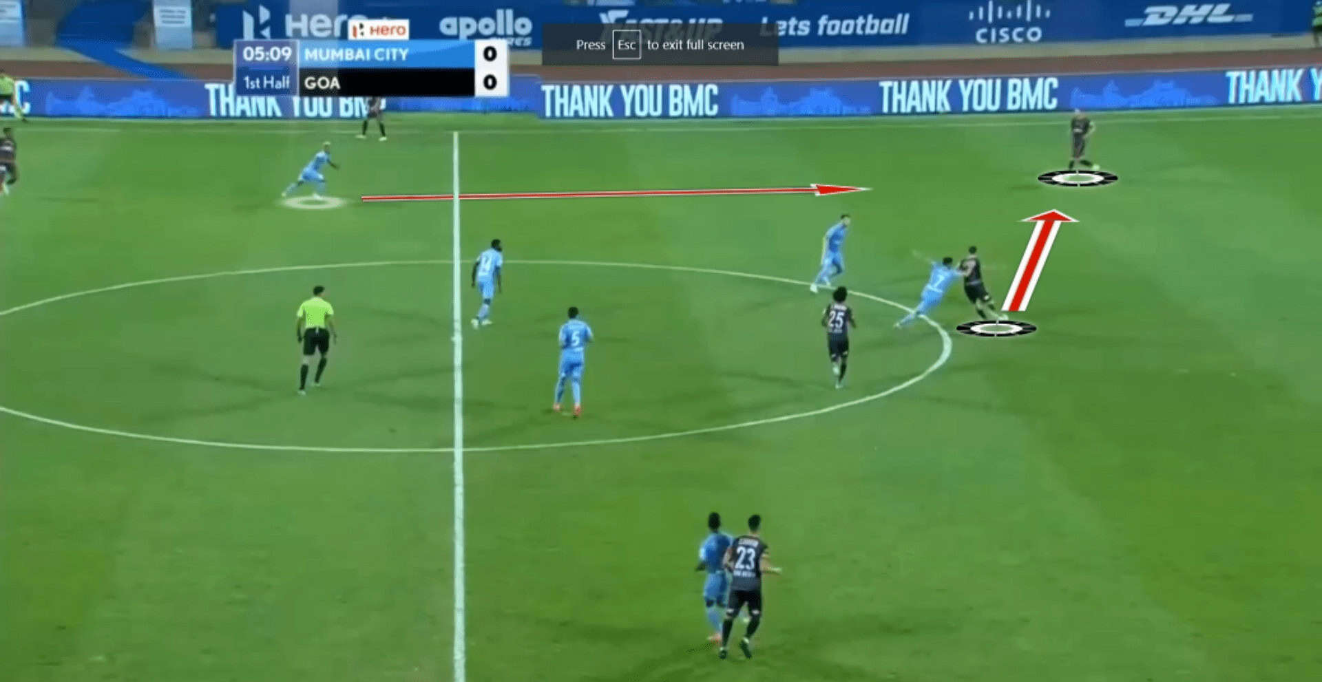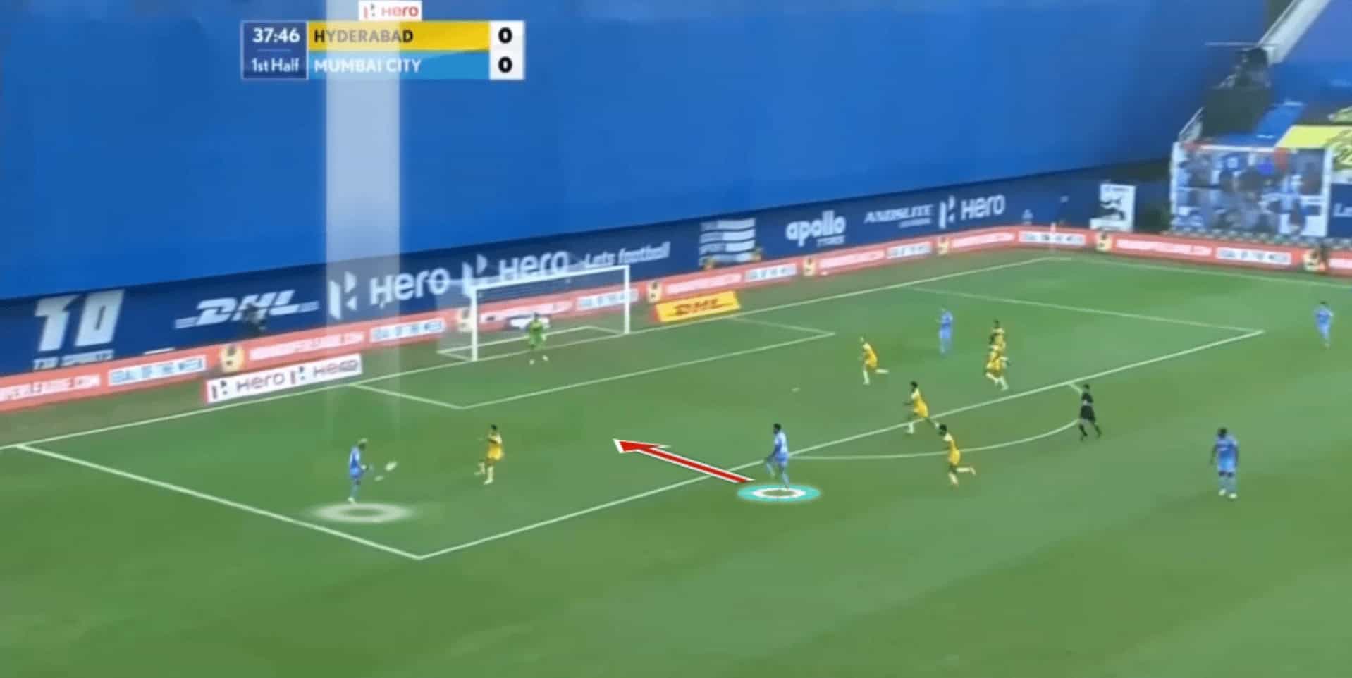 He also plays a vital role in the team’s defensive phase and can always be found in the defending third supporting the left-back when needed, closing gaps and giving the balance that the team needs. Although his number suggests that he has been performing below the league average among other wingers on defensive metrics, we will analyse his impact on Mumbai City’s defensive performances through in-game examples later in this piece.
