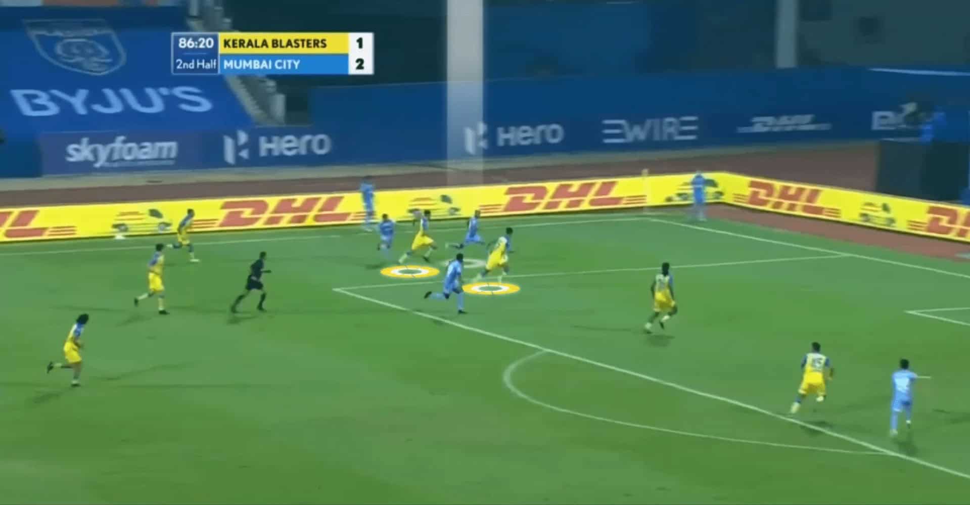 In this image, we can see that Singh has anticipated the pass and has already started to run towards the ball receiver even before the pass is played. The fact that he’s one of the fastest players in the league means that he is able to cover a lot of ground in a short span of time, closing down opponents quickly and giving them no time to react.