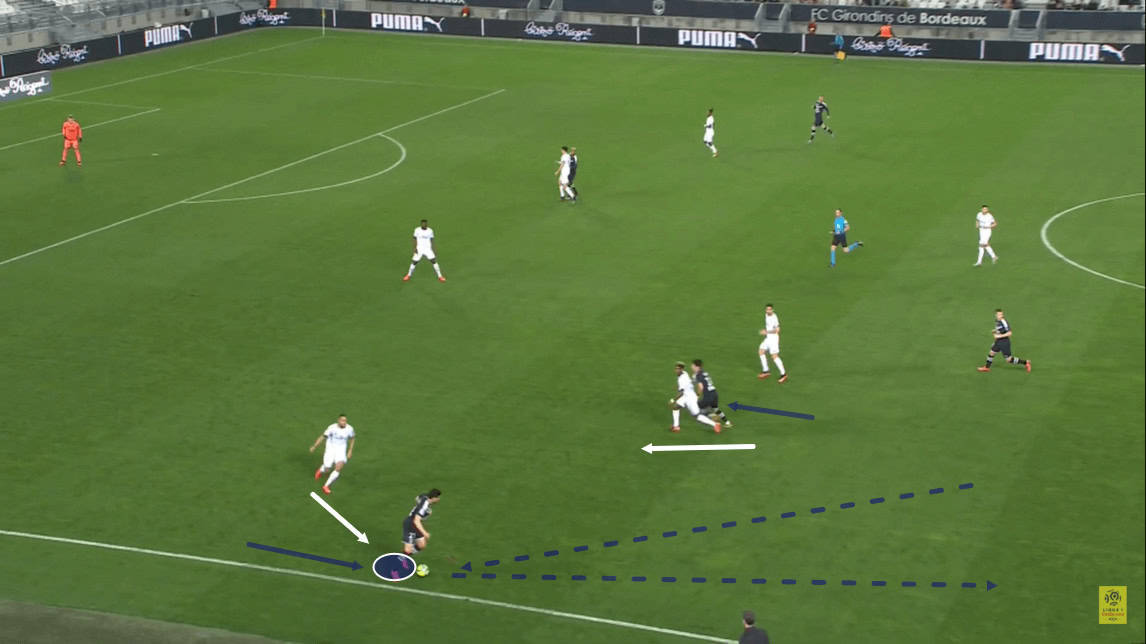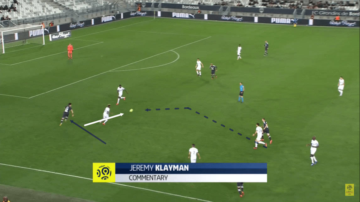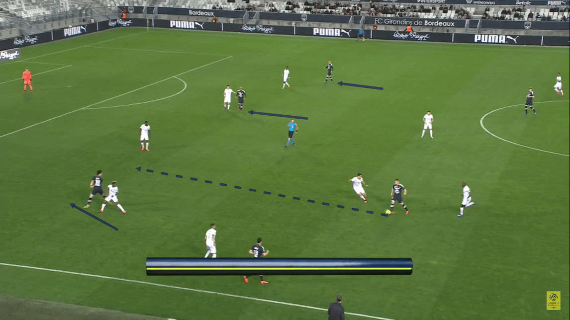 He manages to find a teammate in between Bordeaux’s midfield and defensive lines with this pass, quickly bypassing Les Girondins’ midfield in the process.