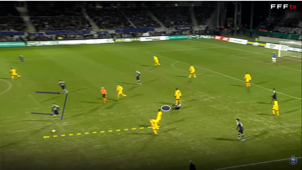 The image above shows us an in-game example of one occasion when left-back Benito played the ball into his near-side central midfielder during Bordeaux’s build-up phase.