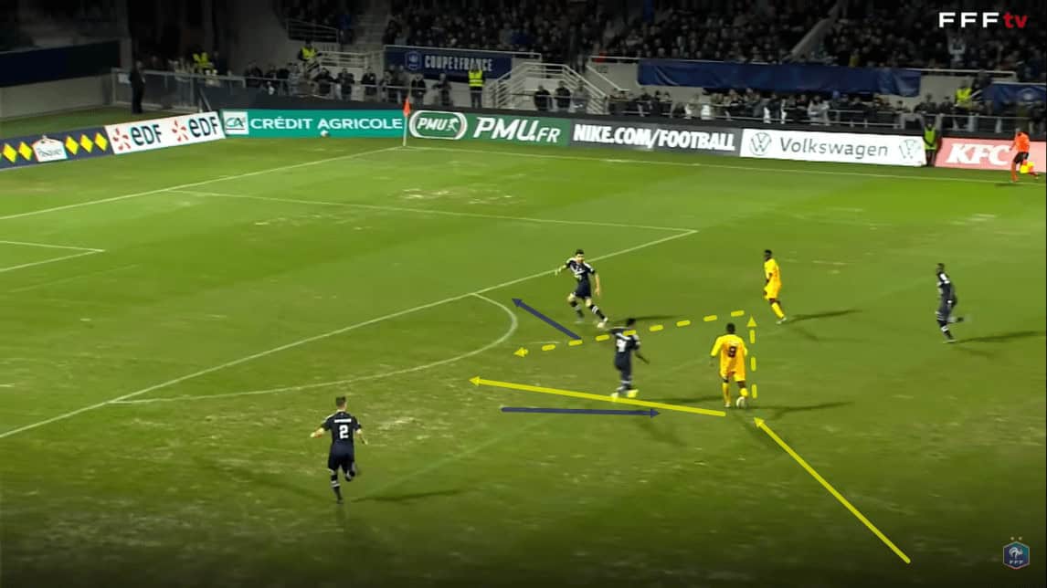 As this passage of play moves on, the Pau attacker carries the ball forward, first beating the Bordeaux right-back as he carries the ball inside and subsequently drawing an aggressive press from one Bordeaux centre-back whilst the other Bordeaux centre-back retreats, attempting to cover in behind.