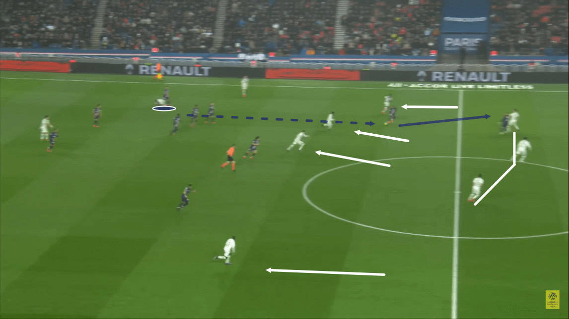 Despite that, this created a large gap between the two lines, which pacey attacker Kylian Mbappé is able to probe into and ultimately receive possession in.