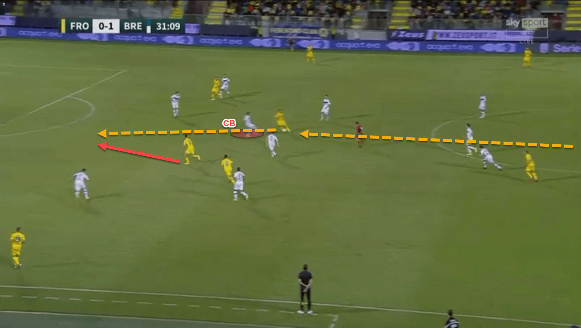 Here, Frosinone have managed to play a pass through the first two lines into a player in front of the backline. As there is no pivot player deep to put pressure on the ball-receiver, the ball-near centre-back from Brescia is forced to close him down.