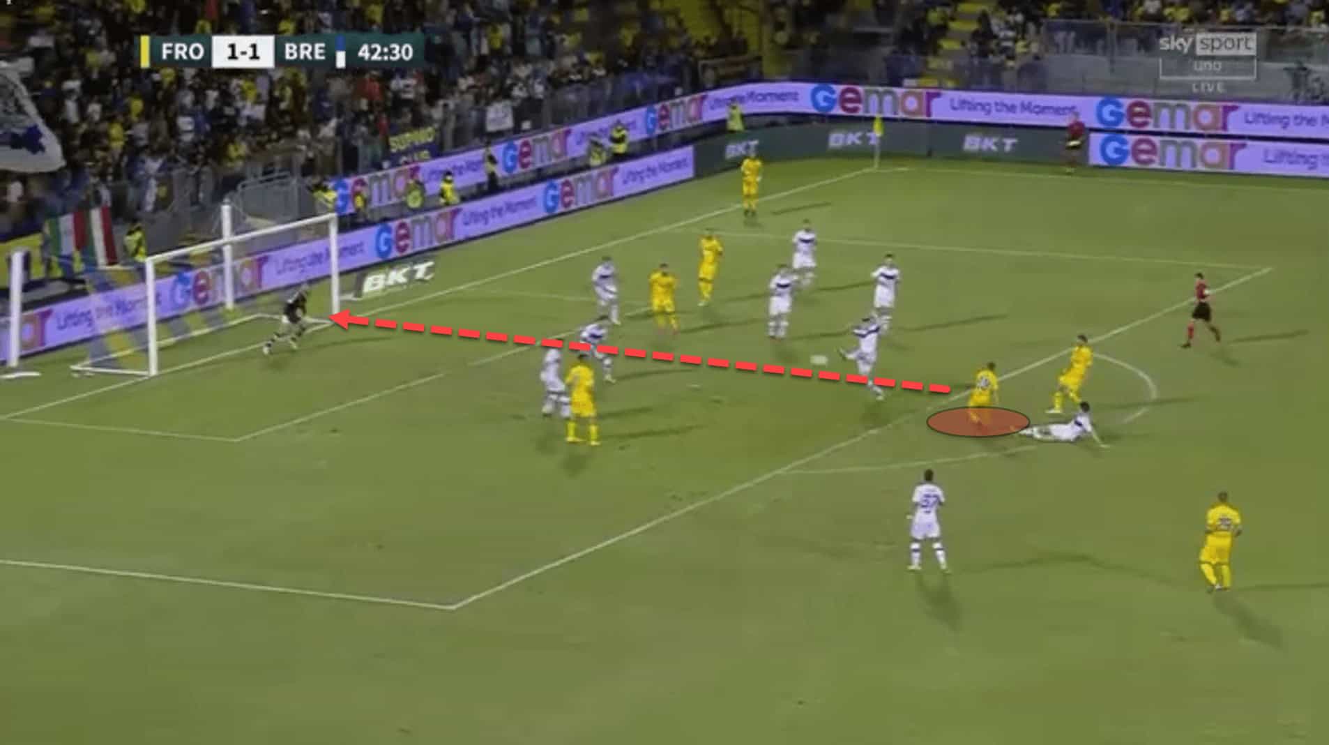 Here is another example of Frosinone taking advantage of Brescia’s poor defensive structure in this manner which eventually resulted in a goal for the home side in what turned out to be a 2-2 draw.
