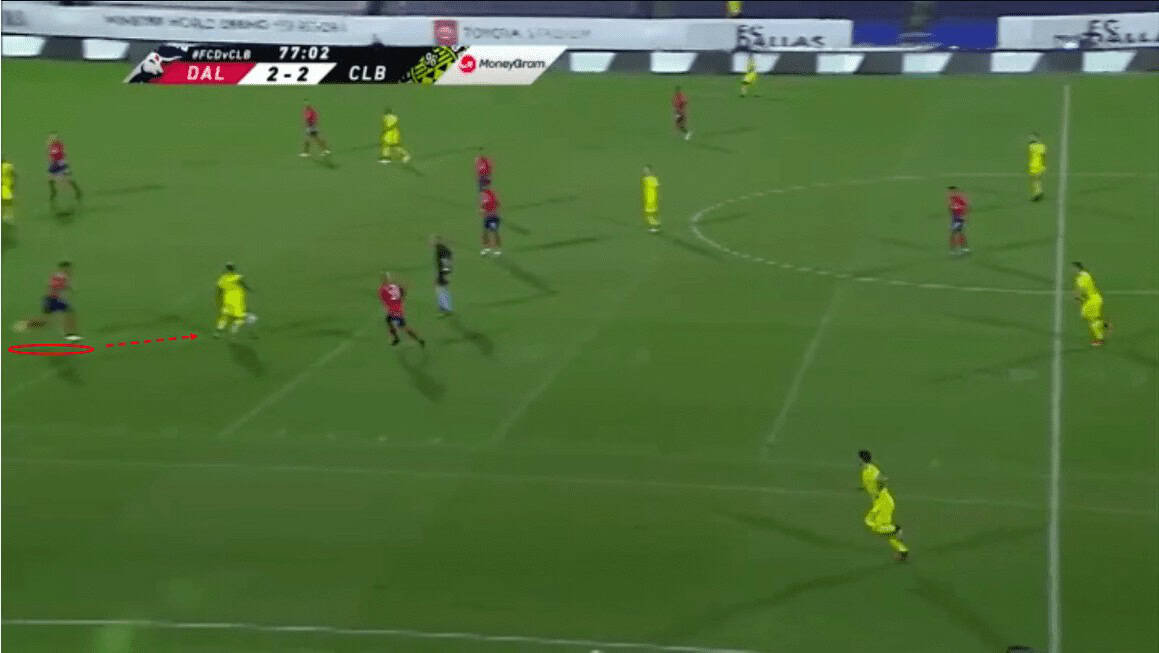 Using his physicality, he forces the ball carrier backwards until he plays the ball back. While this is happening, the rest of Reynolds’ teammates find their defensive shape. Once the ball goes back to a Columbus centre back, Dallas is then able to force play wide.