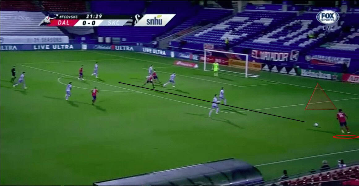 Using his electric pace, Reynolds is able to burst past the defenders to create a 3v3 in the final third. He then tries to pick out Michael Barrios, who is on the far side, with a curling ground cross. Although he is not able to connect the cross, Dallas is able to maintain the pressure with the ensuing corner kick.
