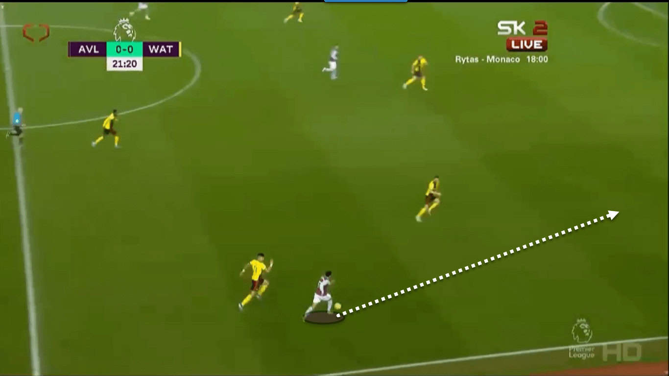 In the image below, it shows the type of run that Samatta will make. Using Watford’s 4-2-3-1 as an example Samatta will run into the gap behind the defensive midfielder and in between the full-back and centre back. Villa target this area as it is an area where the wide player can get to quickly and therefore allowing Villa to create a two vs one against the opposition full-back. What this clipped pass also does is take out the players applying the press meaning there is more space for Villa to target in behind.