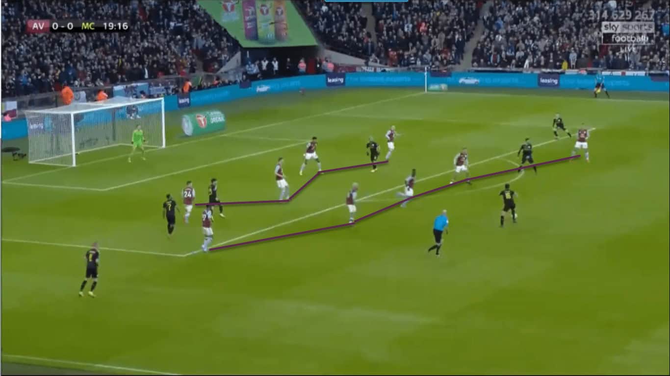 Using the example below Marvelous Nakamba is playing the defensive midfielder role. As illustrated he has moved to a deep position to be the pivot in the middle. What this also does is draw in the press from Manchester City, as Villa are aware they want to press high and in order for Villa to build attacks down the side, Nakamba draws the press inside creating space out wide.