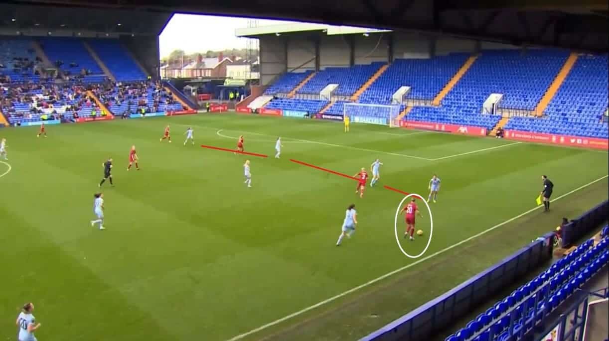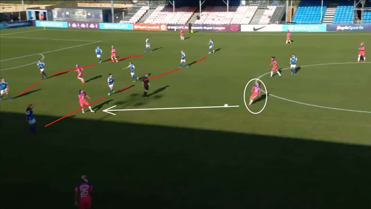 In this case, she has moved into the London City Lionesses half, which was rare for her, and has spotted the run of Barker through the middle, and it was her ability to make these quick decisions and find these players that were really key, allowing Sheffield United to push numbers up the field and create numerical overloads.