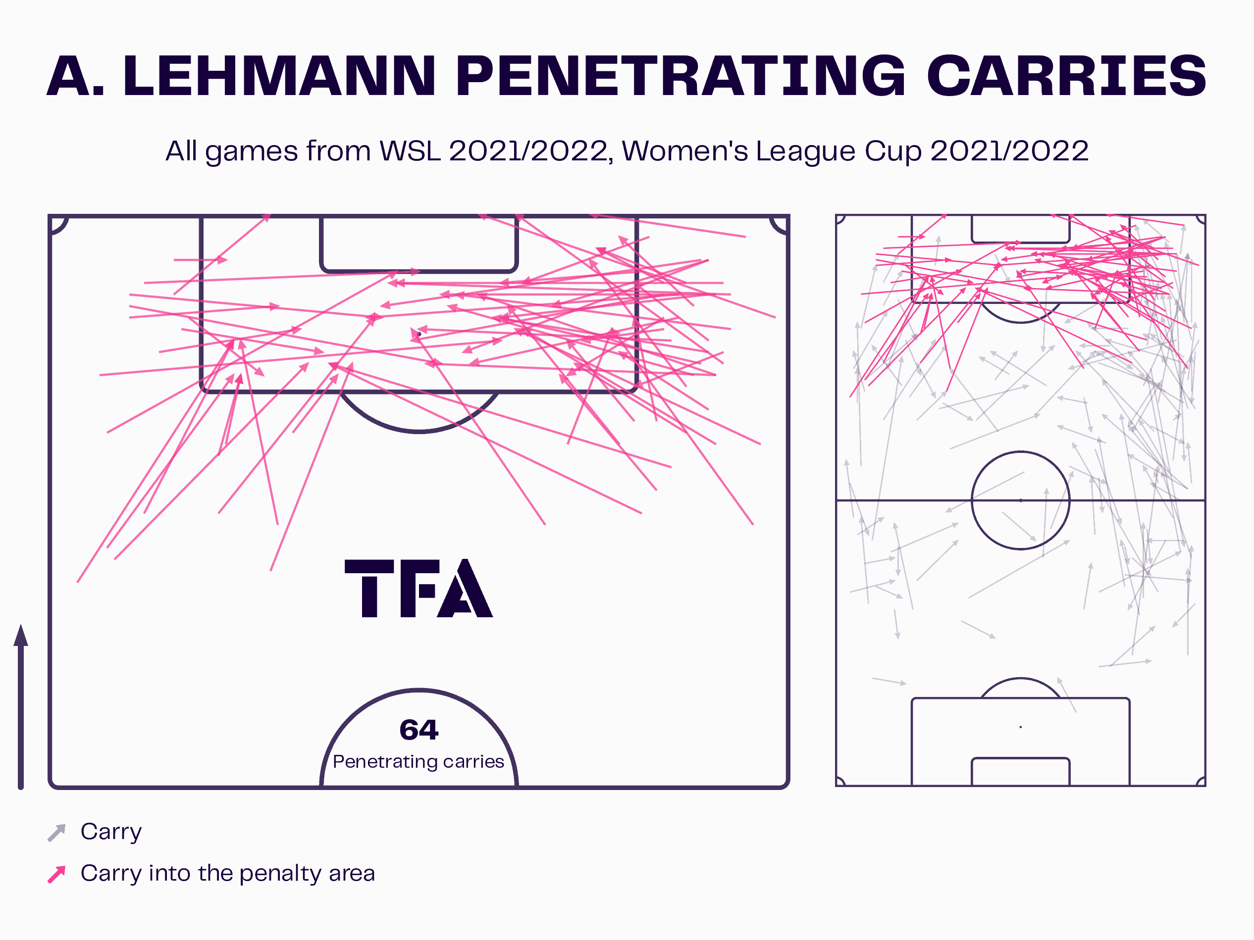 The extent of Lehmann’s contributions during her first campaign at the Poundland Bescot Stadium (as it is now known) is indicated in this graphic, and it is clear just how adaptable she was as a player, with her ability to stay in wider areas and win offensive duels (she was successful in 42.6% of them that season) but also to drive inside when the chances to do so presented themselves.