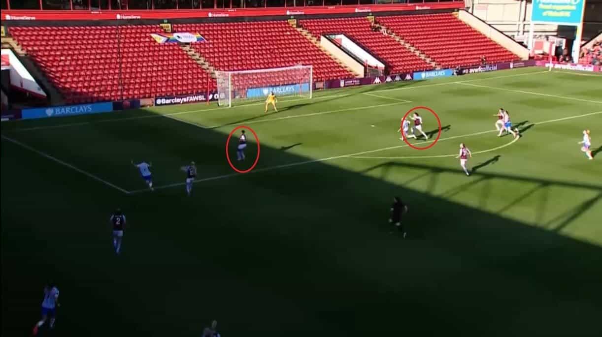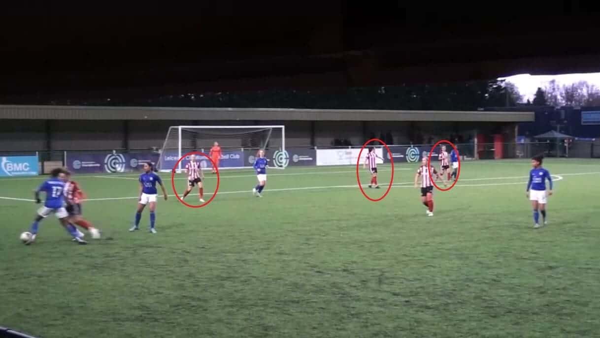 The other benefit of setting up this way was that it freed up those in the central defensive position, in this case, Naomi Hartley and Greece forward Veatriki Sarri, to focus on closing down any potential passing options that the opposing side might look to use, and that was particularly important against Leicester here as they had pace in their ranks from the likes of Lachante Paul and Jamaica international Paige Bailey-Gayle.