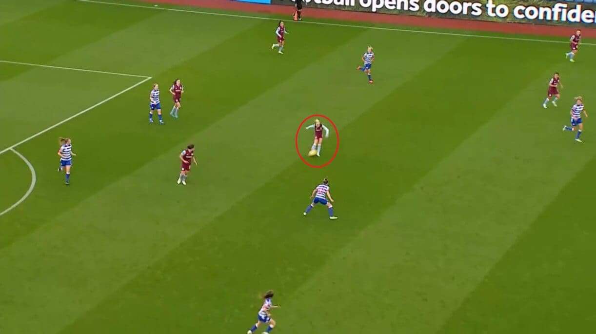 In this game, Reading were doing their best to prevent the ball from travelling upfield and so Laura Blindkilde Brown, who is another to have significantly benefited from the new style, has opted to make an aerial pass instead, and this shows the increased levels of intelligence that so many players at the club now have.
