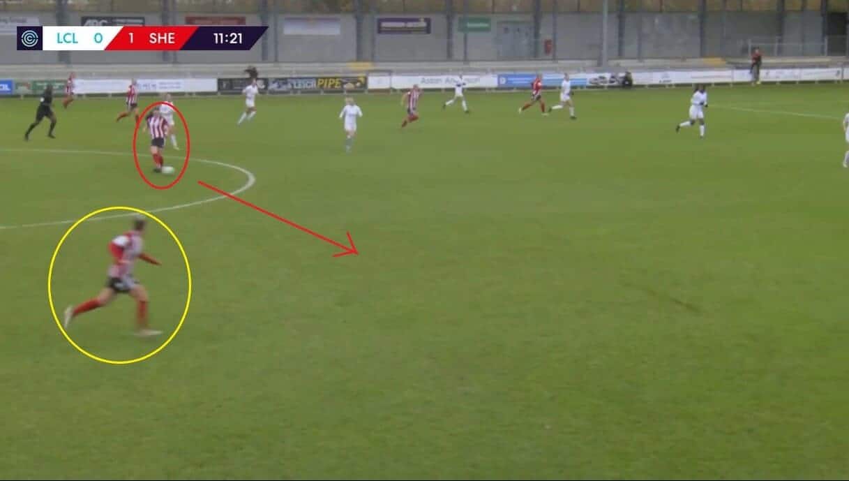 The key point to make here is not that Sophie Barker, now back on loan at the club from Leicester City Women, edged forward to receive the initial pass ahead of its current position, but that Alethea Paul, on the near side of the field, made a simultaneous run that allows the ball to keep moving forwards and enables Sheffield United to transfer it behind Blackburn before they can drift across and react to the danger.