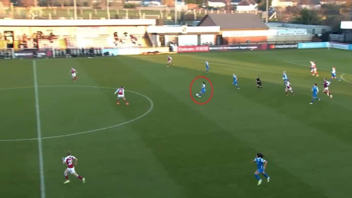 Time after time, her ability to play long balls up the field, as she is doing here against Arsenal Women, proved to be the catalyst for Birmingham to create chances in advanced areas, and her ability to find lone striker Claudia Walker in those spaces was one of the key features of Birmingham’s overall game plan.