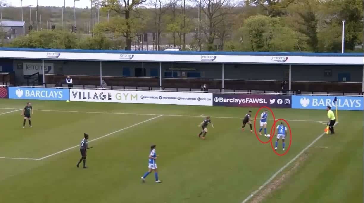 In this case, Olivia Fergusson (now at Celtic Women) is the player in the wide role, with Paul running inside her, and what Fergusson does well here is that she edges slightly infield before releasing the ball, drawing the Blackburn player nearest her out of position and giving Paul a better chance of receiving the ball without being under immediate pressure.