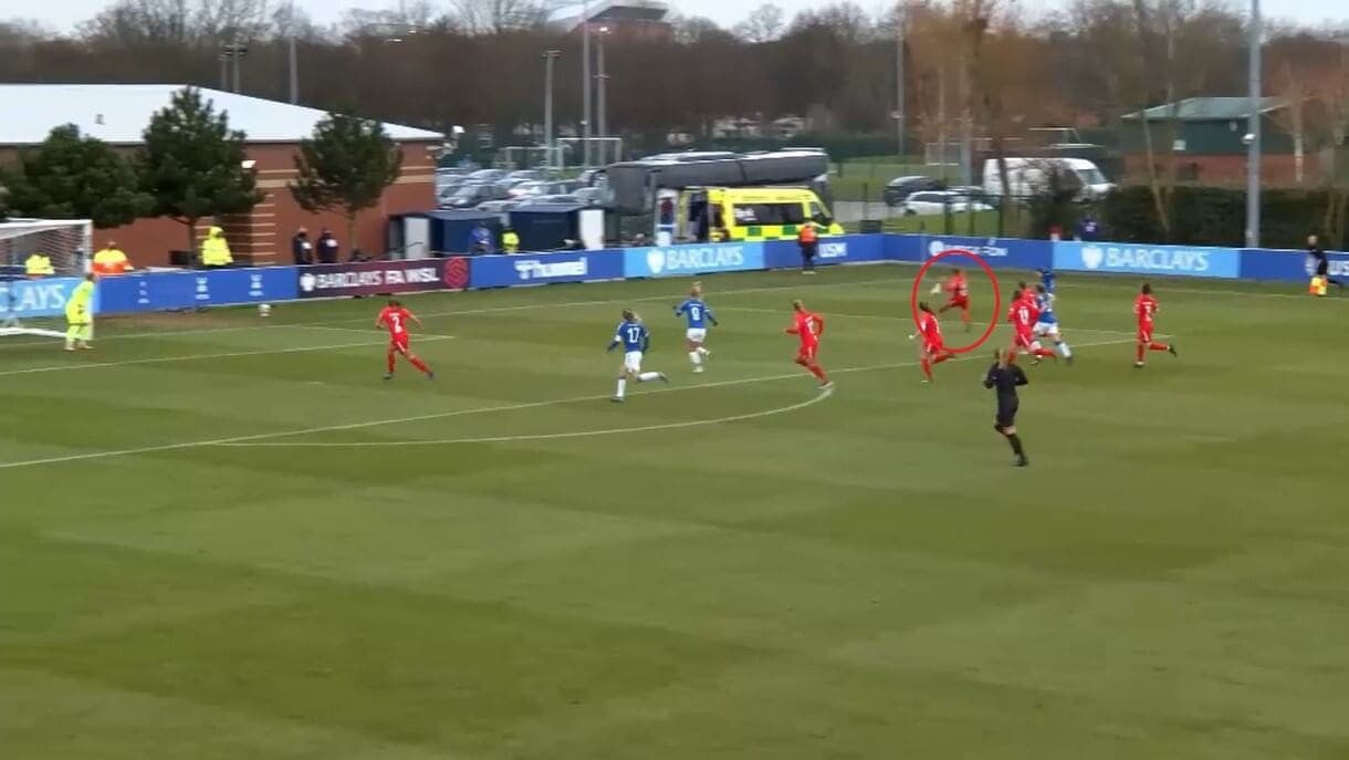 Her ability to do what was necessary was particularly important against Everton Women, who were then under the management of now-Leicester boss Willie Kirk and who played a style of football that saw their wingers act as their primary threats, and that is true here too as Australia winger Hayley Raso has received a forward pass from Holloway’s fellow Northern Ireland international Simone Magill.