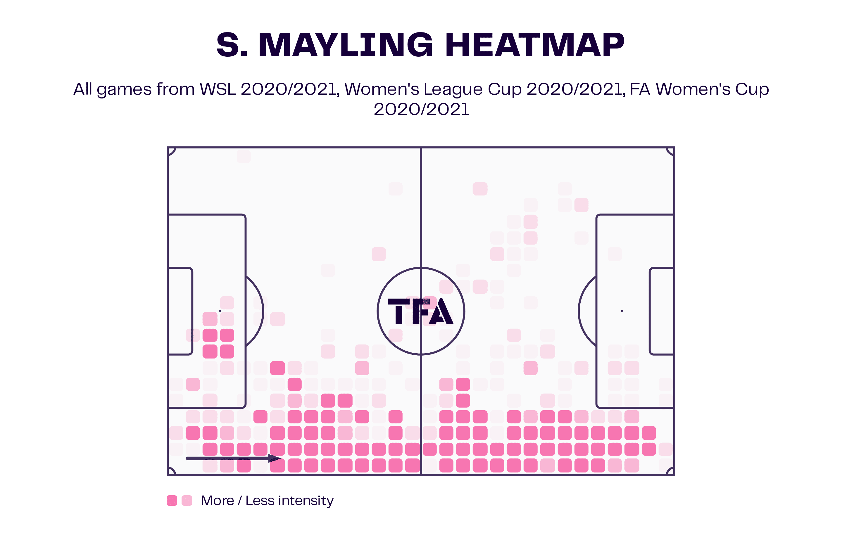 Having the right support on the wings was also something that Ward needed to find but as with everything else regarding the team, she had limited options available and needed to use what was already in the squad. With that in mind, she recognised early on that Sarah Mayling liked to push higher up the field and that fellow right-back Harriett Scott was a more combative player. As a result, she played Mayling almost as a right-winger and slotted Republic of Ireland international Scott in behind her.