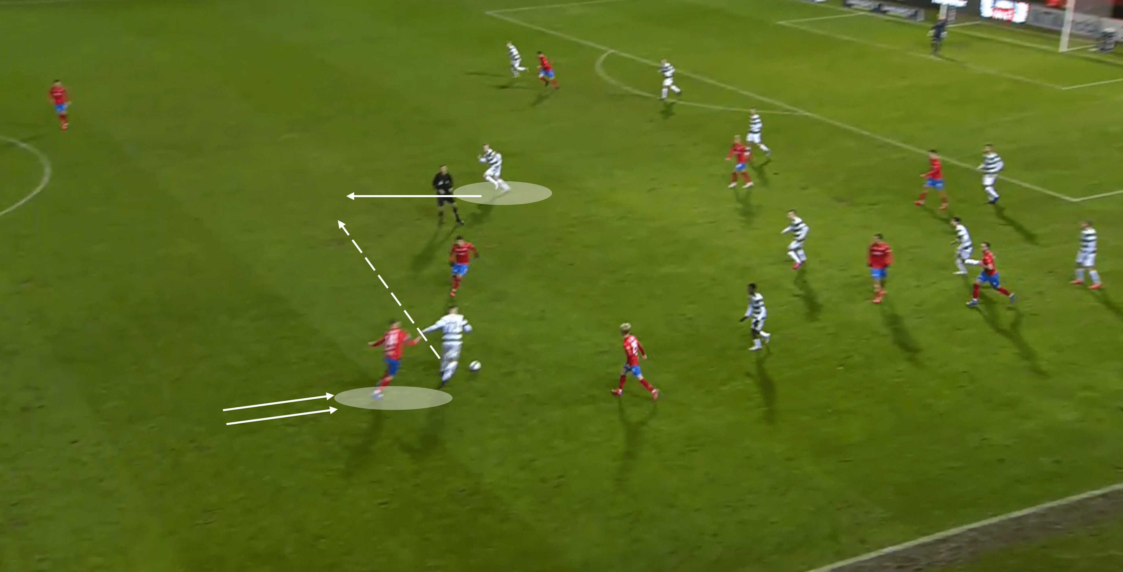 While the obvious options for the next pass would’ve been the right back or the goalkeeper, Widell has shown the attacking determination to progress the ball quickly when suitable.