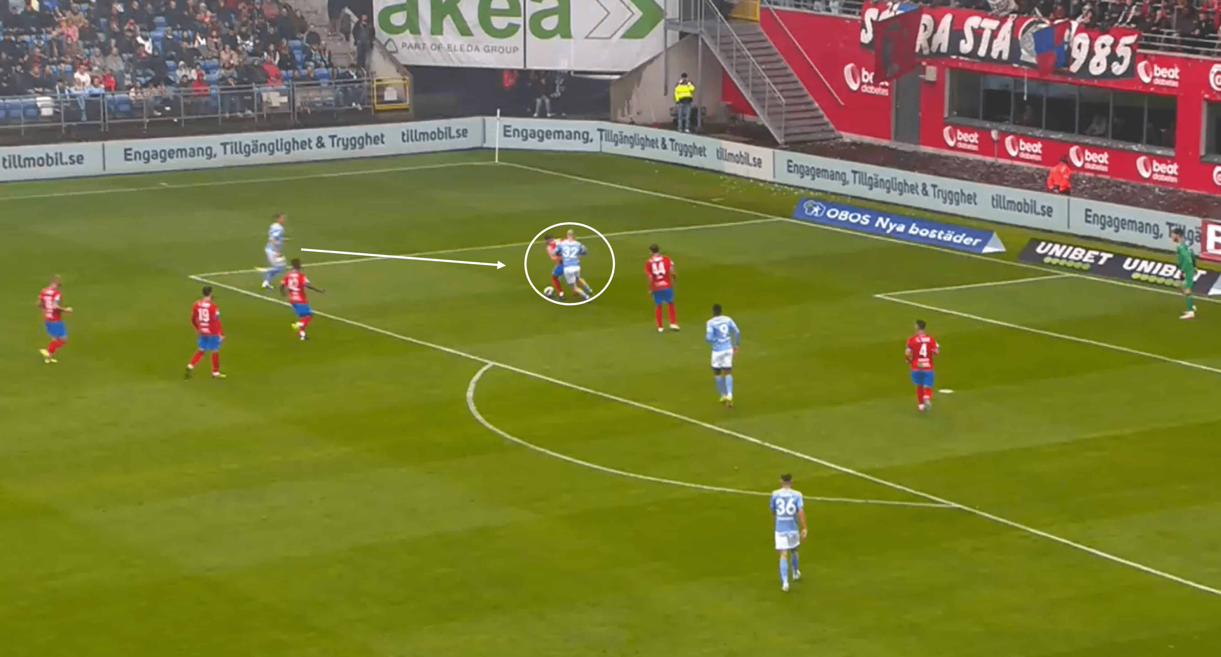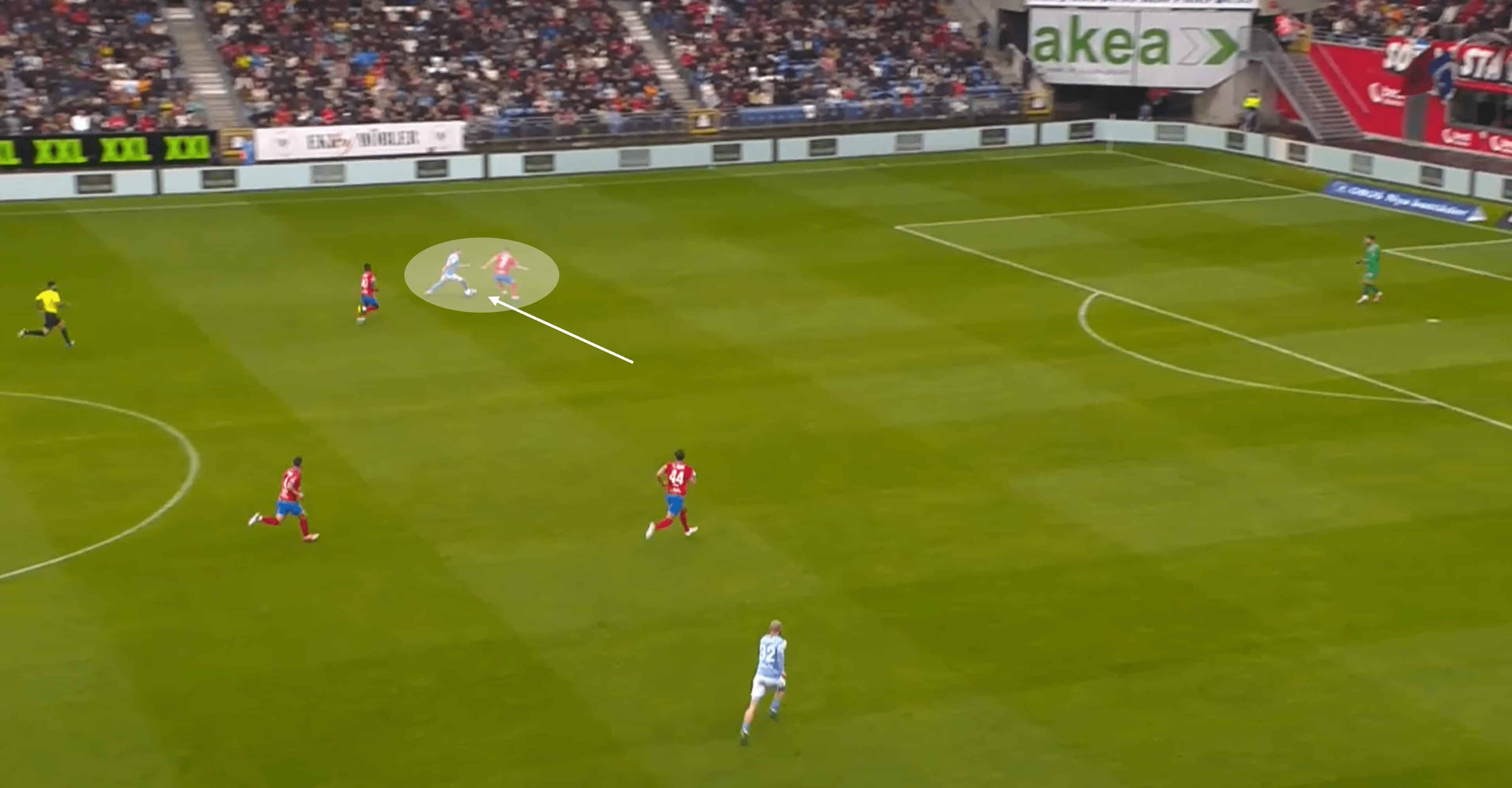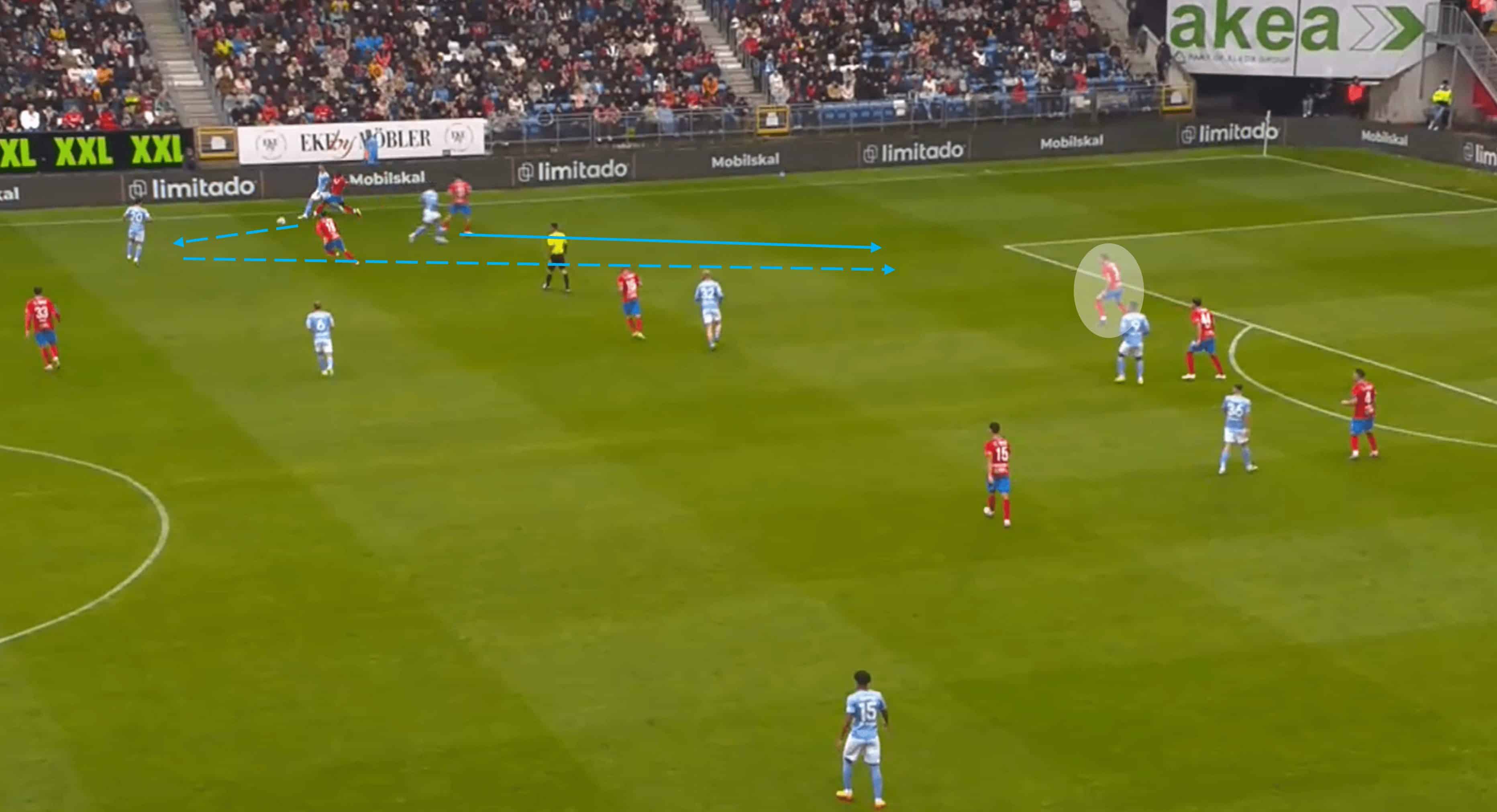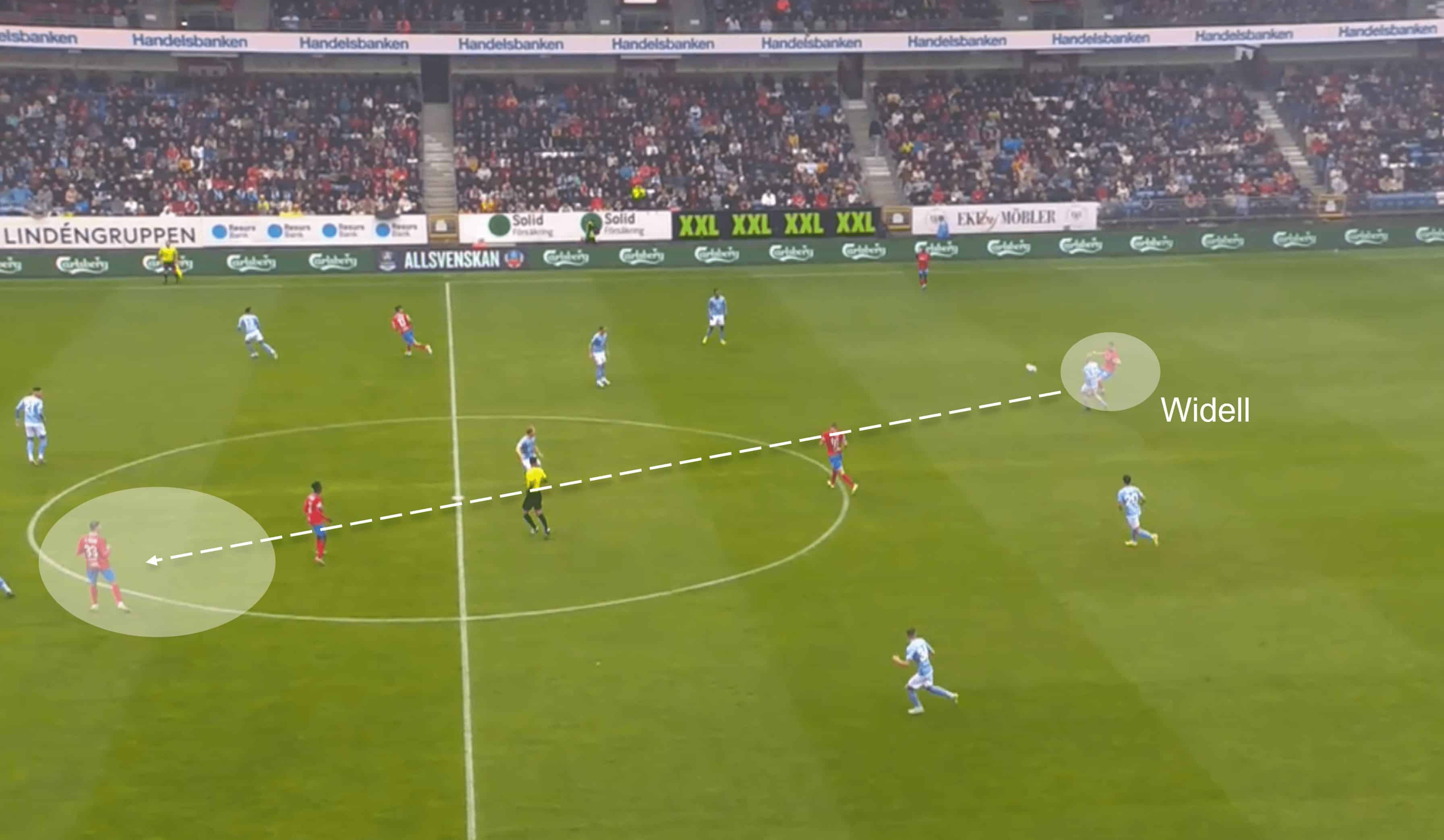 We can see Widell demonstrating this in the analysis above, and it came at a critical moment as Helsingborg’s right-back got involved in the duel further up.