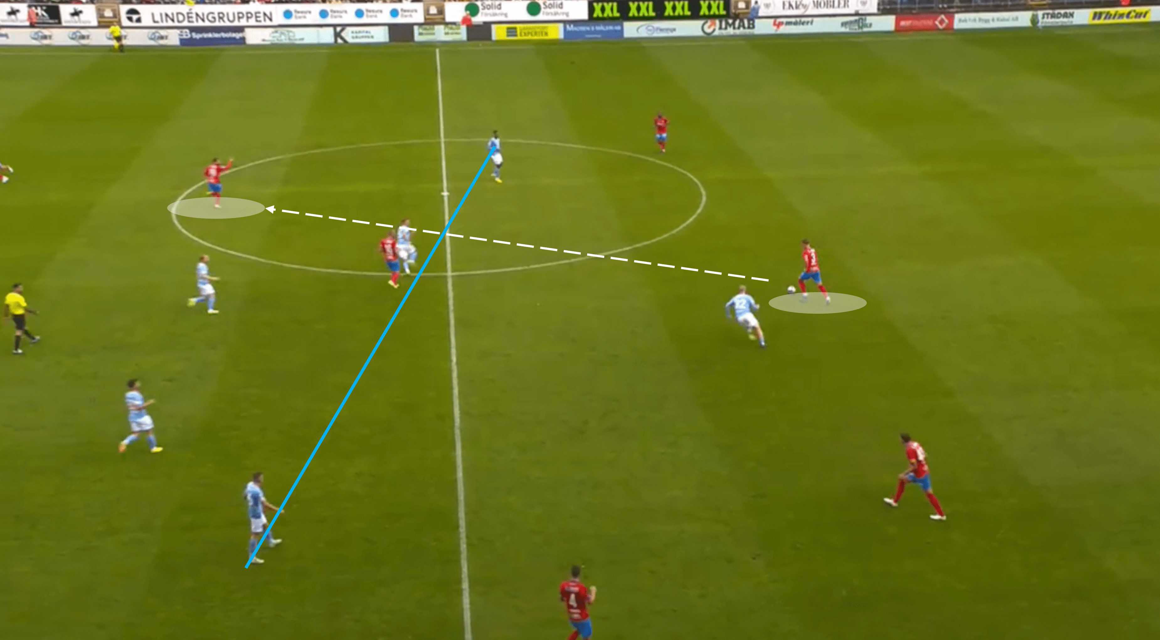 This pass not only relieved pressure on Helsingborgs’ backline but presented an opportunity for a transitional attack/move into the midfield third.