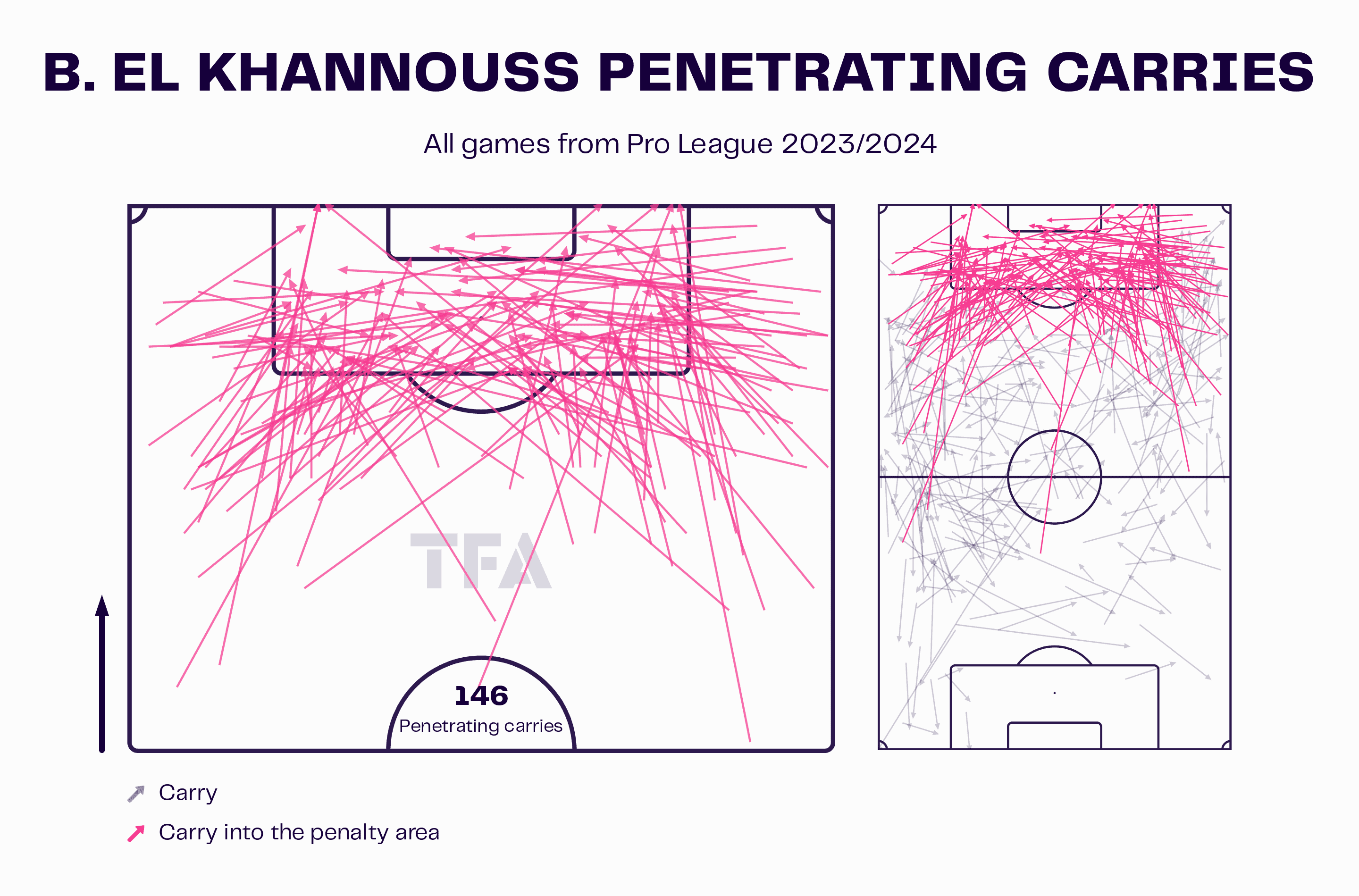 Once again, we can examine the player more in-depth using a penetrating carries map, and if anything, El Khannouss is more dangerous in this regard than Tillman was. The Moroccan international plays primarily this season for Genk as a ‘10’, although he can also play as an ‘8’ or a ‘7’. At the time of writing, he has three goals and six assists this season.
