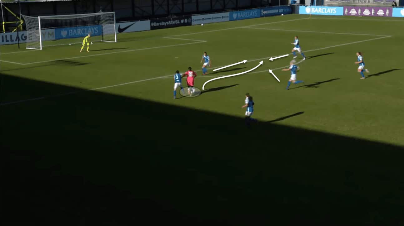 Another aspect of England’s play includes playing in other players and is used as an alternative method of breaking down teams who play with a low block. This is a problem Chelsea face regularly in the FAWSL because of how dominant the Blues are in possession. Poachers usually struggle against these types of opposition but England’s improved ability to link-up creates another dynamic for Chelsea given their tendencies to play wide or central in build-up.