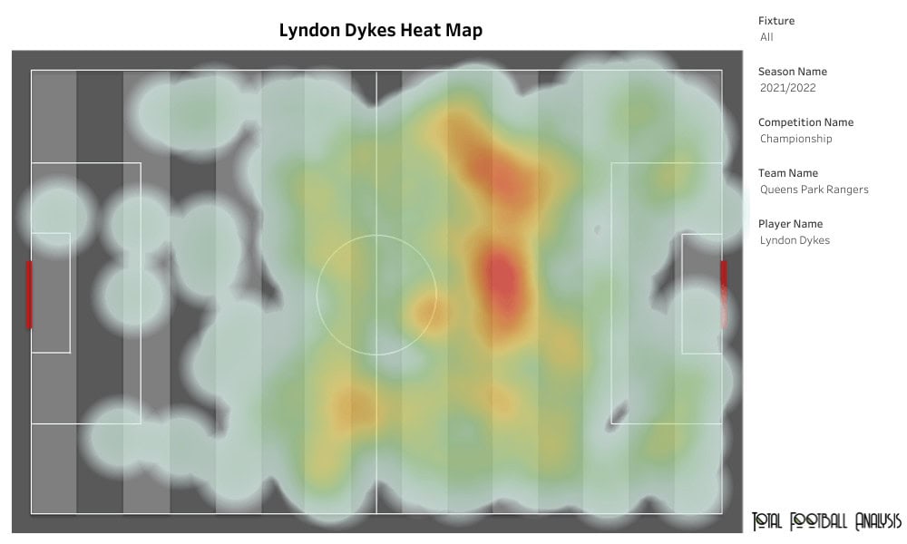Dykes is an aerial threat as he is 1.88 metres tall (6’2”). Winning the most aerial duels out of any QPR player and 15th most in the Championship this season, Dykes takes up more positions around the typical target-man area where flick-ons would be possible.