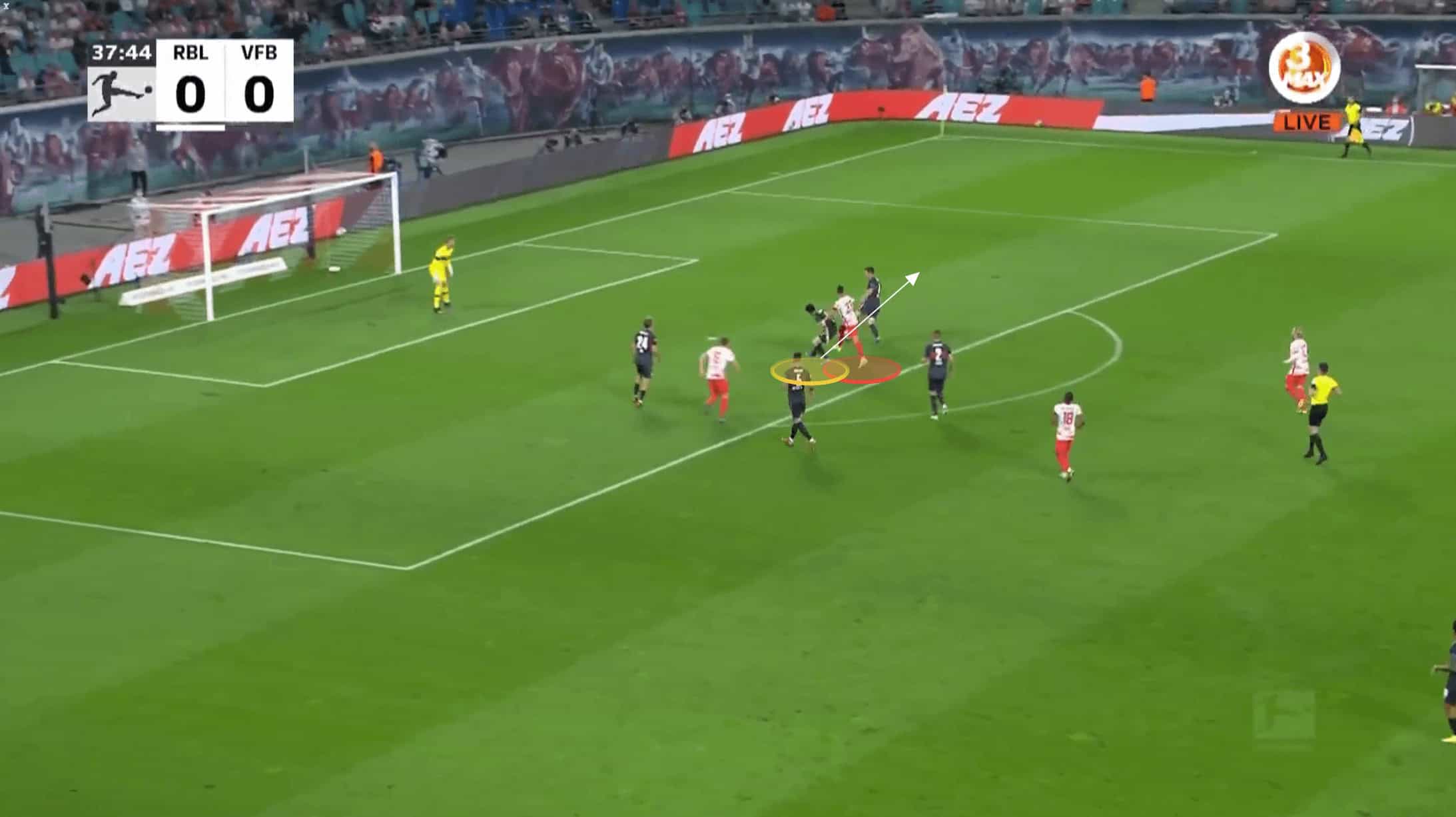 An in-game example of this is seen in the following two images where Leipzig’s attack is thwarted in the final moments by Bochum.