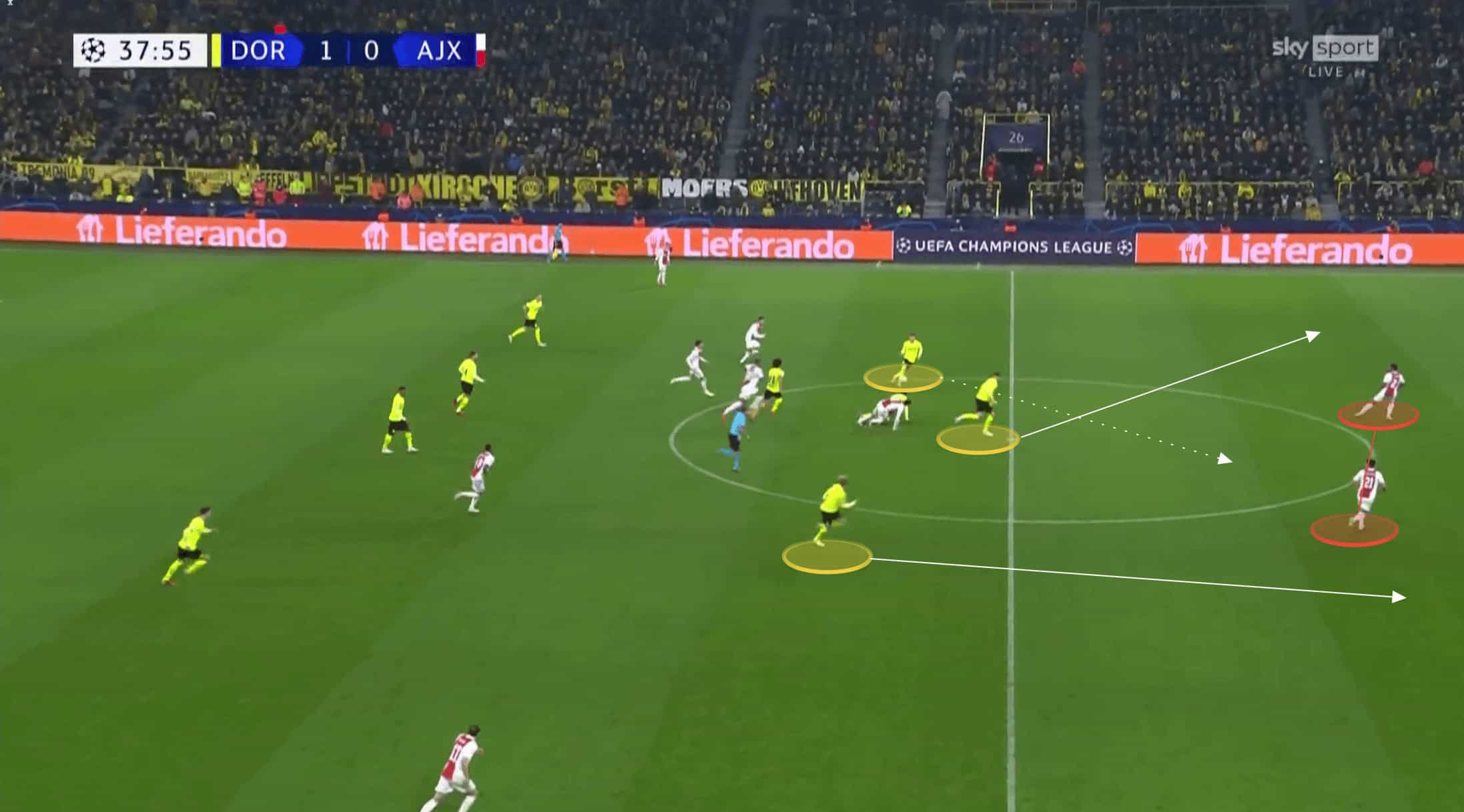 Upon winning the ball, the opposition can transition into an attacking set-up. For example, it could be the case that the full-backs push forward and leave the centre-backs isolated. If the counter-press can be structured in a way where players are ready to push forward quicker than these full-backs can drop back, for example, then it can lead to an attacking overload on the counter. This can be seen in the next image where Dortmund regain possession and immediately have three attacking runners against two Ajax defenders.