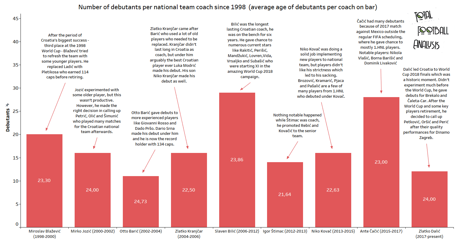 Croatia has 20 counties plus the capital city, Zagreb, which is counted as a separate county. We can divide Croatia into four regions: Slavonia, Dalmatia, Kvarner & Lika, Istria and Central Croatia. We can see that Dalmatia has produced the most Croatian international where the main club is Hajduk Split, which produced the second most debutants per club, but we can assume they missed on many quality players from their region letting them play for the league rivals. The last graph shows how many debutants came into the squad under each national team coach since 1998.