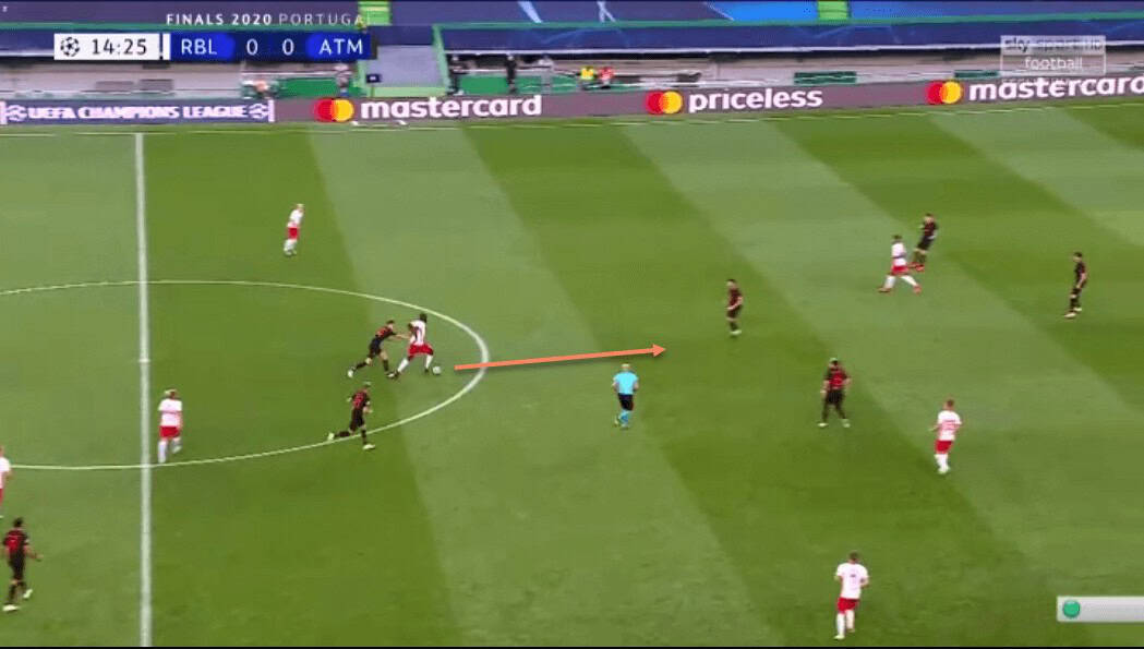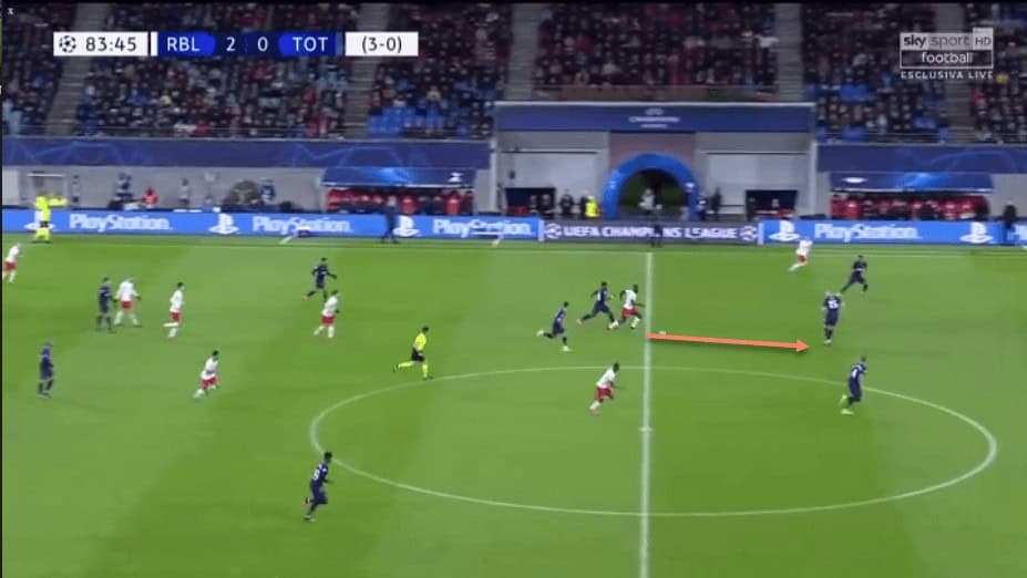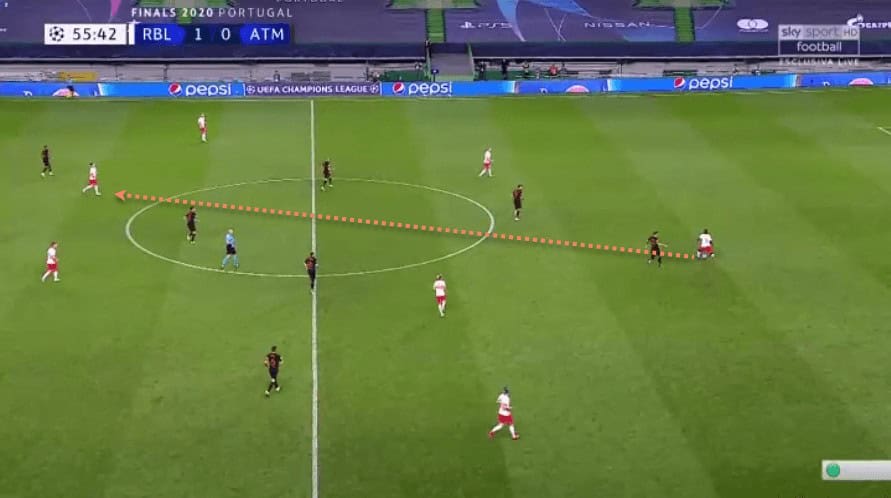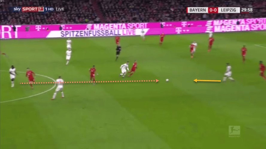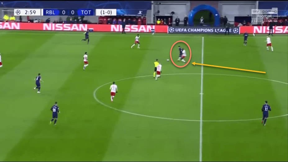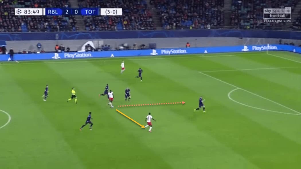 We have already spoken about Upamecano’s recovery pace. This has allowed him to get back and regain possession even after making a mistake high up the pitch, or simply to cover when an opposition forward has broken through RB Leipzig’s defensive line.