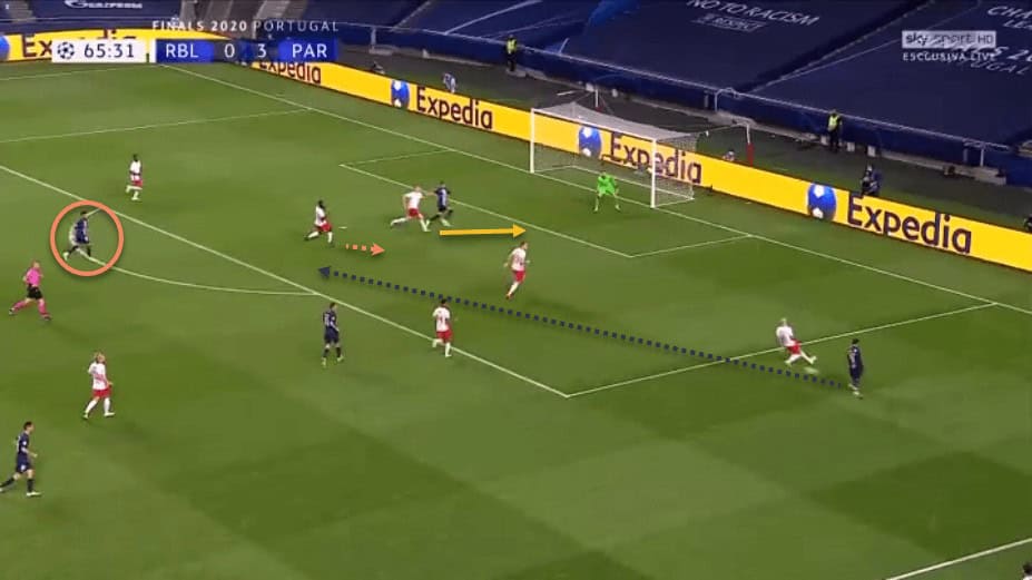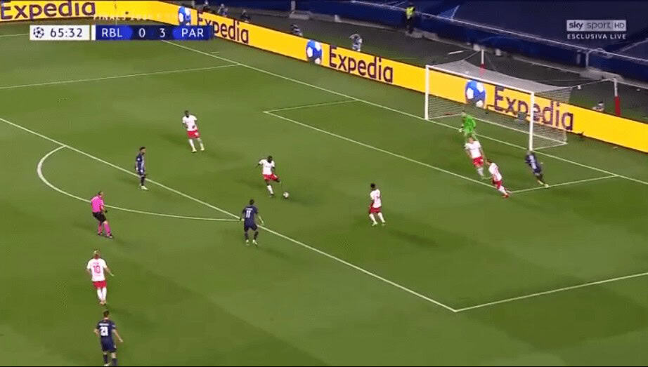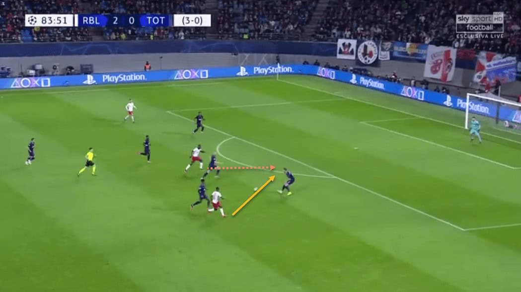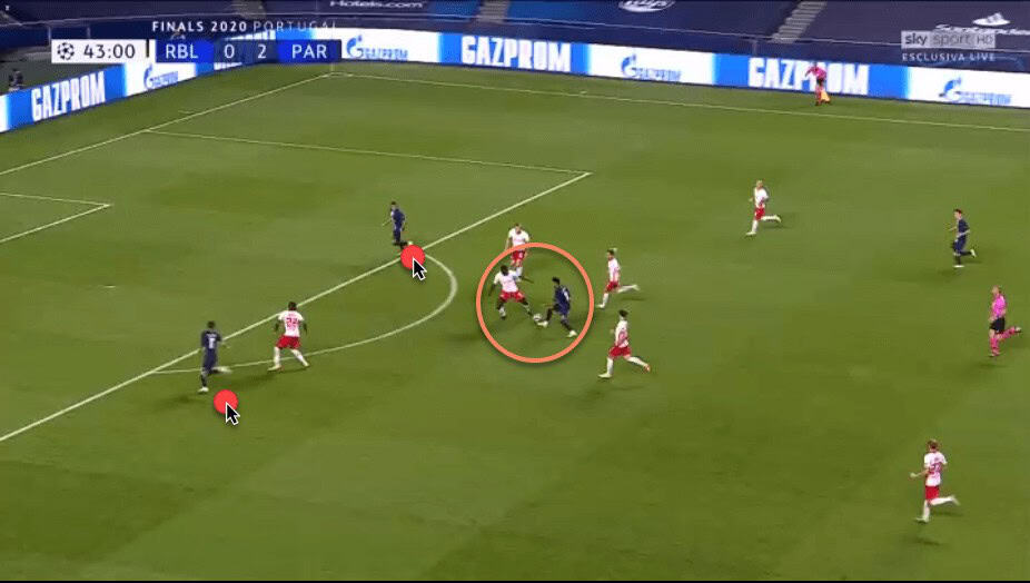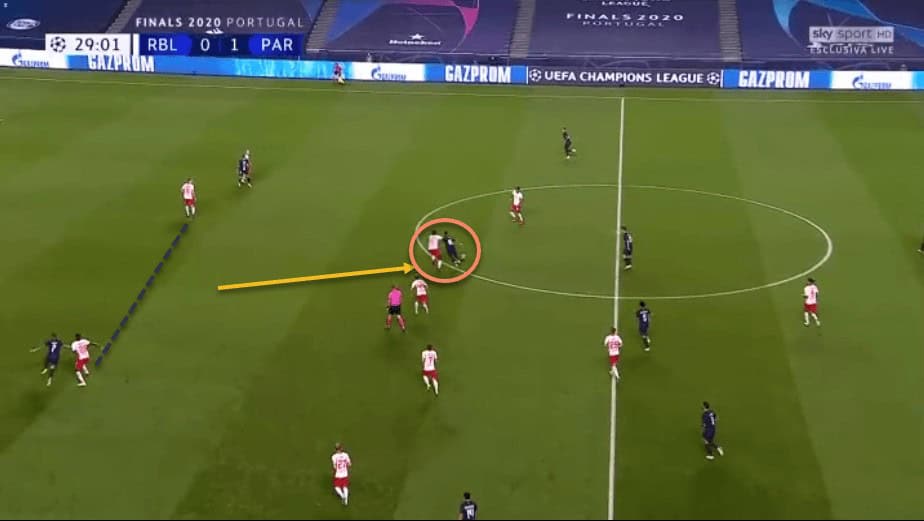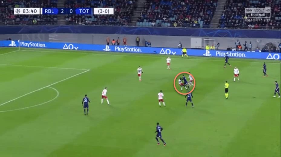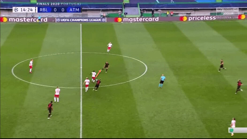 We have already spoken about Upamecano’s recovery pace. This has allowed him to get back and regain possession even after making a mistake high up the pitch, or simply to cover when an opposition forward has broken through RB Leipzig’s defensive line.