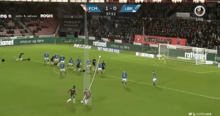 Midtjylland have mastered the long switch routine which allows a player to make an unmarked deep run into the area. In the image below, the first player triggers the run to start.