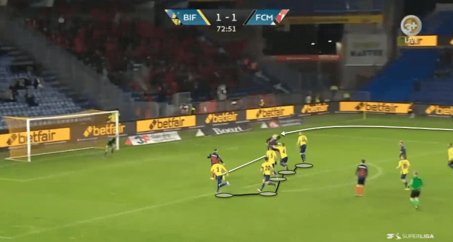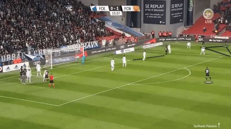 The play continues and they opt for their go-to short corner routine, whereby they retain possession by playing it backwards, and thus their opponents naturally move out from their deep position to the edge of the box. They mainly regroup centrally to cover the space in the defence, but this leaves Nordsjælland free to use the wide areas for overloads and getting players in behind into the highlighted area. As we can see in the image, there are two free players on the left and a 3v2 overload on the right-hand side.