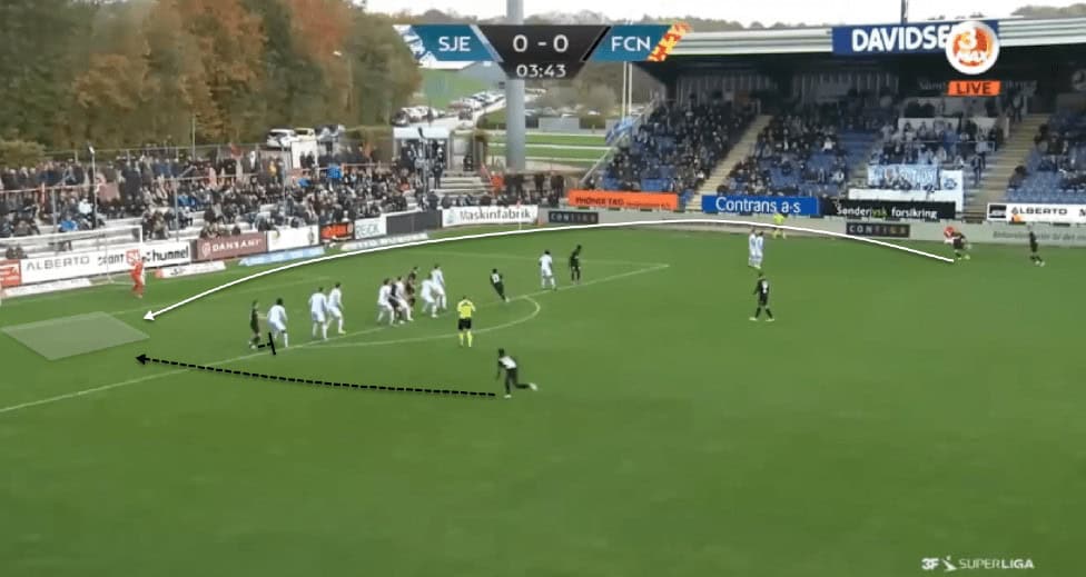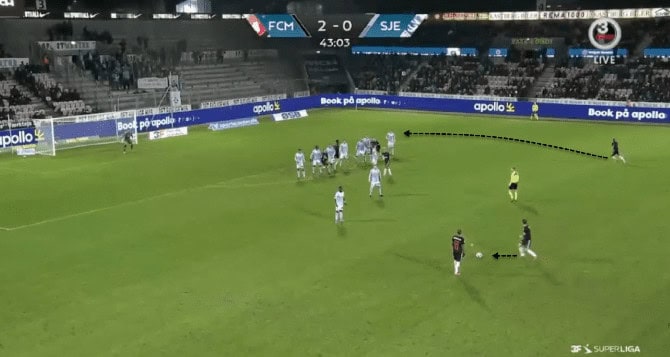 Earlier we saw Midtjylland include the use of screens, however, Nordsjælland are no strangers to it as well; they use them less but still involve them in some routines. In their free-kicks, they often go for the long switch where a player will run from deep. In the image above, the dummy over the ball triggers the deep player to run towards the far post, in conjunction with a screen on/blocking of the back post marker.