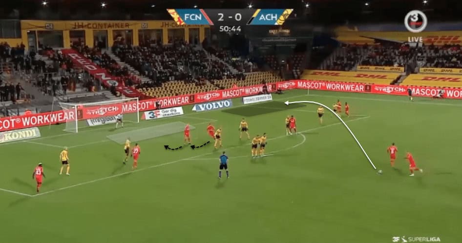 However, the player’s next movement in the penalty box serves to free up the shooting lane. In the image below, you can see Nordsjælland players splitting, with two going to the near post and the other two going to the far post, which frees up the shooting lane in the centre.