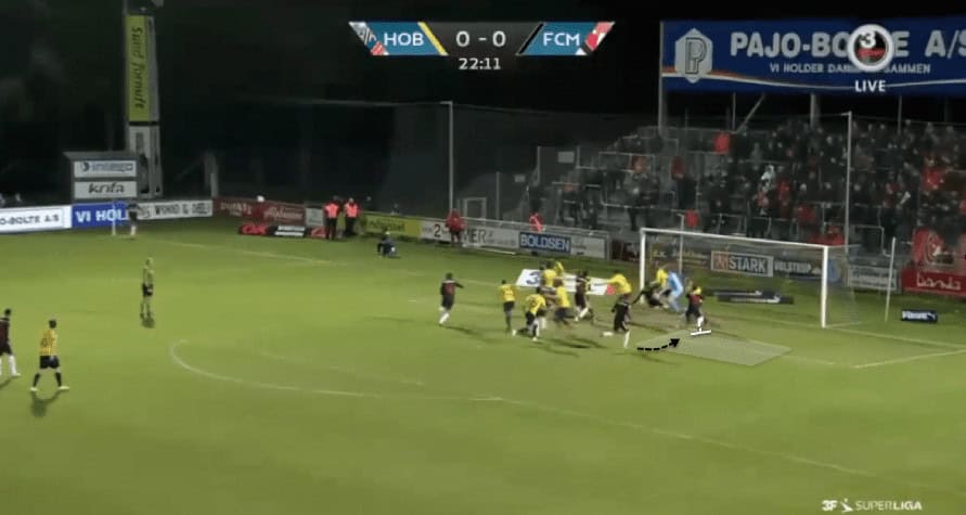 From the data, two teams have stood out and we will delve into their tactics using footage to see why they are so successful. The first team is Midtjylland for their significant emphasis on penalty area deliveries, as well as them ranking the highest for far post deliveries as well. Midtjylland were also the most effective in the league as they took a shot 36.4% of the time, which resulted in them also being the top scorers from set-pieces (11).